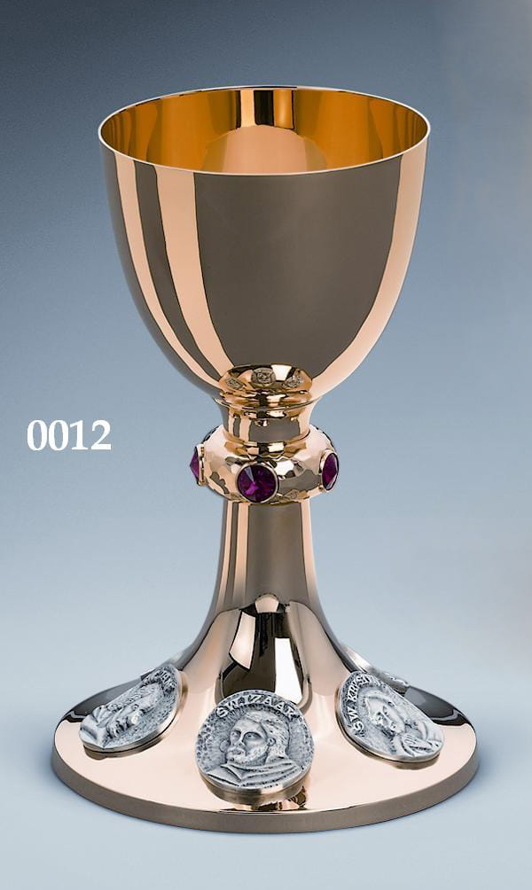 Kielich mszalny z medalionami, mosiężny, złocony 24-karatowym złotem. Nodus z czerwonymi kamieniami. Na podstawie kielicha zaprojektowano medaliony z wizerunkiem czterech Ewangelistów.