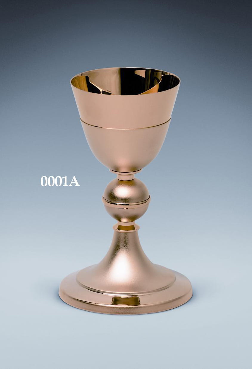 Kielich mszalny z medalionami, mosiężny, złocony 24-karatowym złotem. Nodus z czerwonymi kamieniami. Na podstawie kielicha zaprojektowano medaliony z wizerunkiem czterech Ewangelistów.