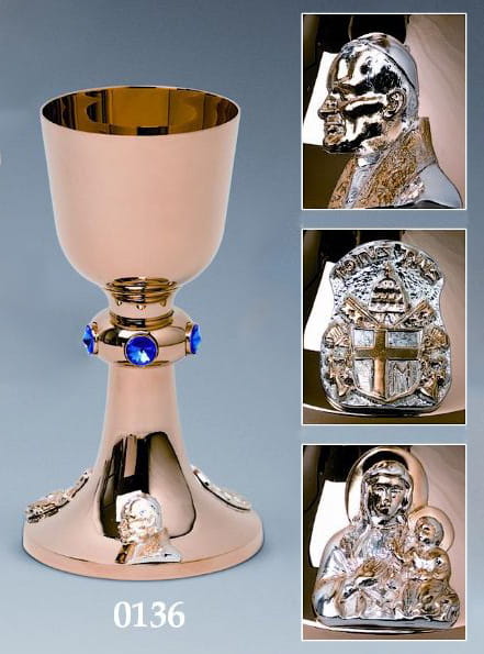 Kielich mszalny Maryjny, wykonany z mosiądzu. Złocony 24-karatowym złotem. Nodus zawiera 5 dużych kamieni niebieskich kryształów Swarovskiego. Podstawa kielicha ozdobiona trzema wizerunkami (Jan Paweł II, herb, Maryja z Dzieciątkiem Jezus)