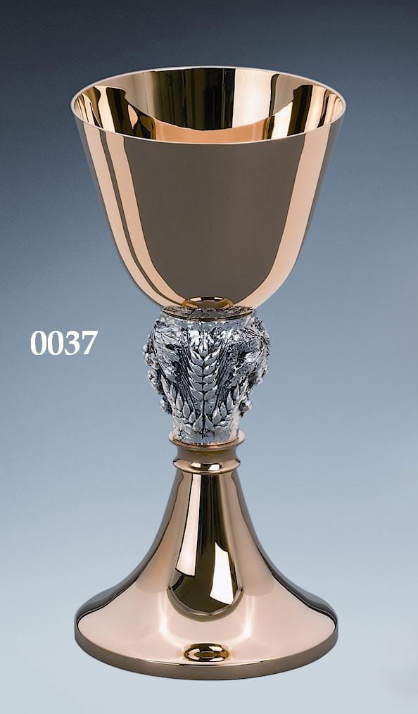 Kielich mszalny z medalionami, mosiężny, złocony 24-karatowym złotem. Nodus kłosy zbożowe. Na podstawie kielicha zaprojektowano oksydowane medaliony.