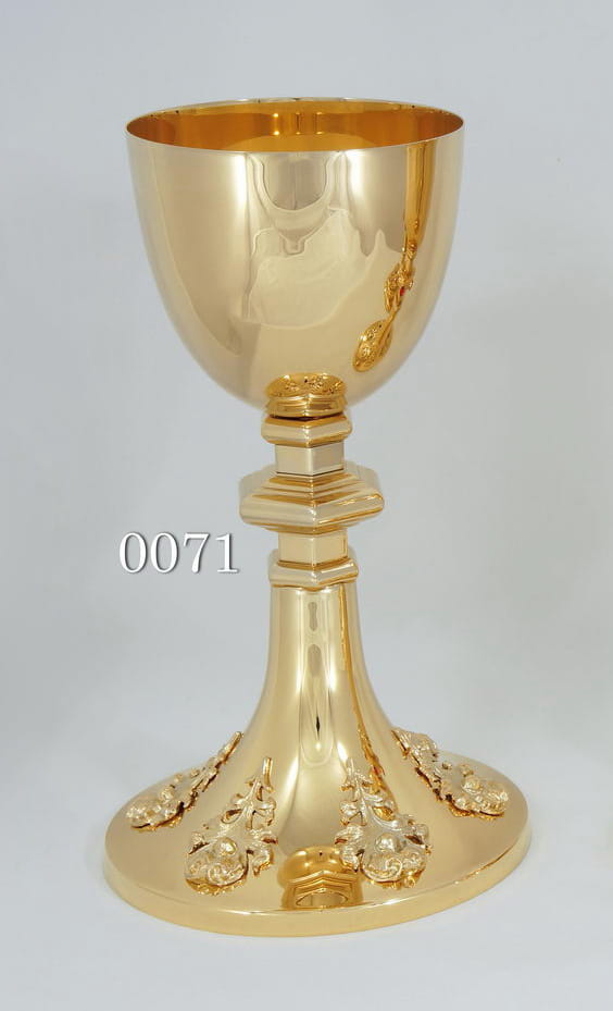 Neogotycki kielich mszalny, mosiężny. Złocony 24-karatowym złotem. Nodus sześcioboczny wysadzany sześcioma czerwonymi kamieniami. Podstawa kielicha udekorowana liśćmi.