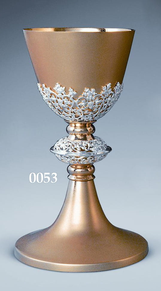 Kielich liturgiczny mosiężny złocony 24 karatowym złotem ze srebrnymi ażurami.