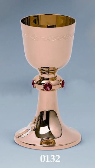Kielich mosiężny którego czara ozdobiona jest grawerem korony cierniowej, a podstawa kielicha krzyżykiem wielkanocnym. Nodus wysadzany kamieniami Swarovskiego 5-szt.