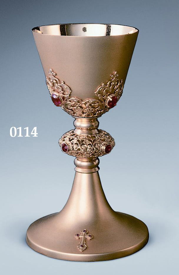 Kielich liturgiczny mosiężny złocony 24 karatowym złotem. Zdobienia ażurowe a w nich kamienie rubinowe.