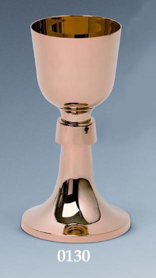 Neogotycki kielich mszalny, mosiężny. Złocony 24-karatowym złotem. Nodus sześcioboczny wysadzany sześcioma czerwonymi kamieniami. Podstawa kielicha udekorowana liśćmi.
