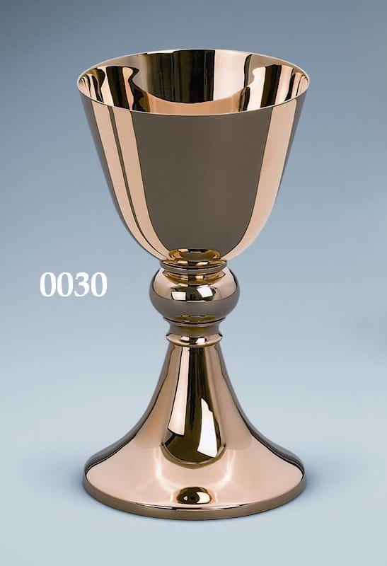Kielich mszalny niski wykonany z mosiądzu, złocony 24 karatowym złotem. Nodus kula. Polerowany na połysk.