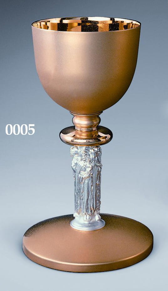 Kielich mszalny mosiężny z kryształowym modusem złocony 24 karatowym złotem.