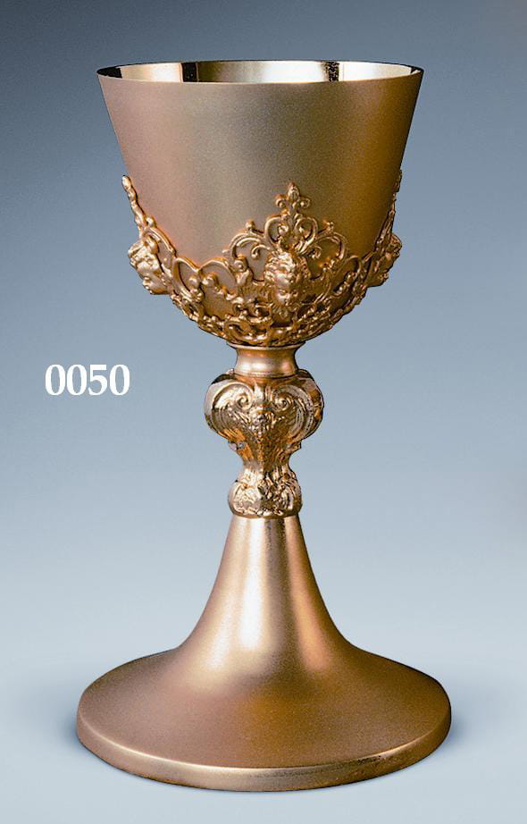 Kielich mszalny mosiężny, bogato zdobiony, złocony 24 karatowym złotem.