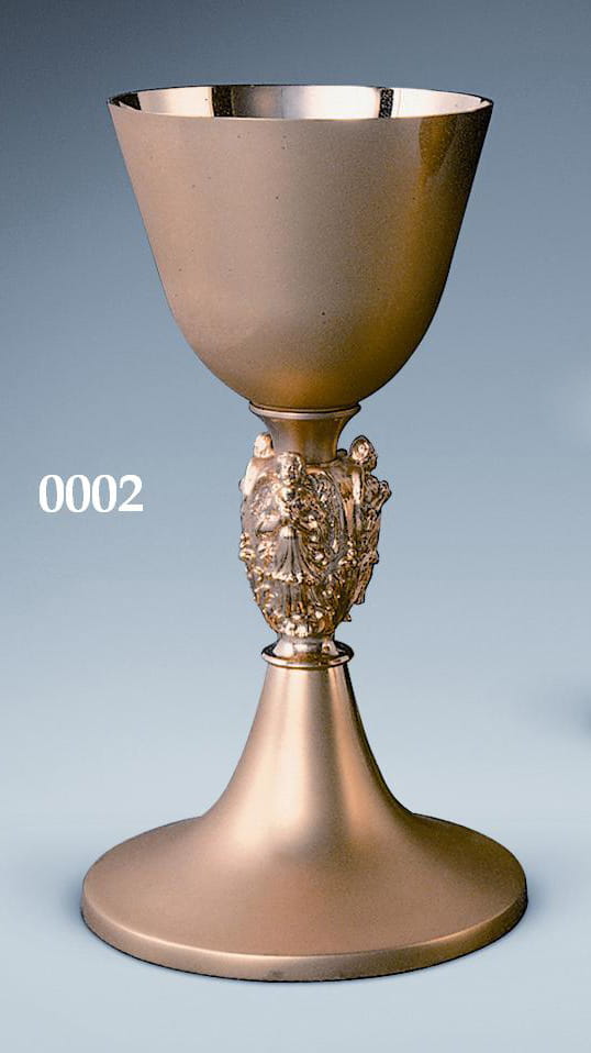 Kielich mosiężny, złocony 24-karatowym złotem. Nodus ozdobiony aniołami w modlitwie.