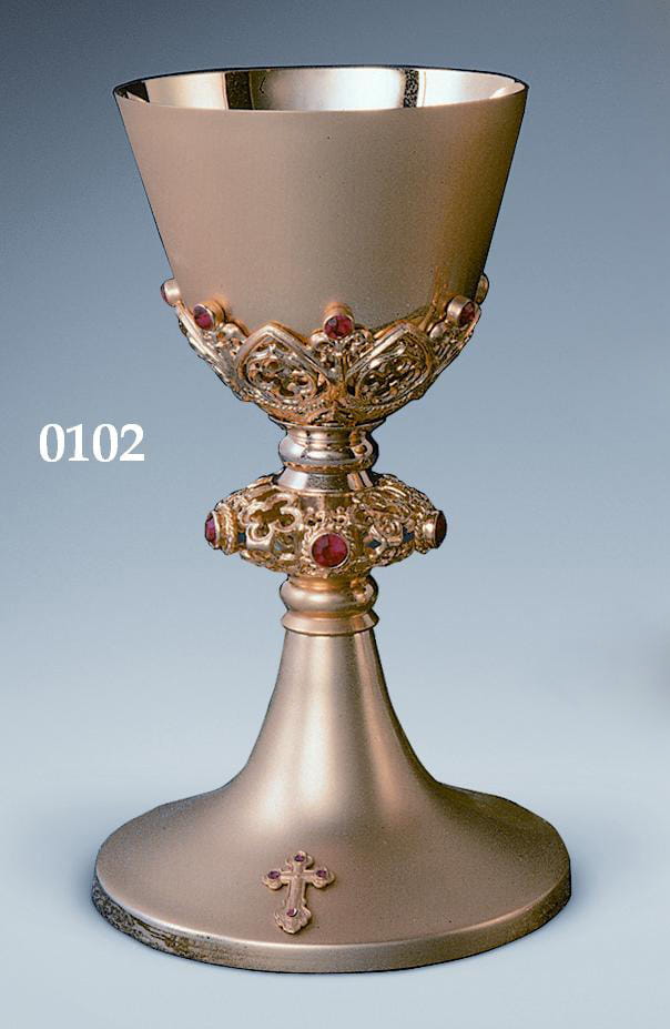 Kielich liturgiczny mosiężny wykończony na lustro. Ażurowe zdobienia. Nodus i koszyk kielicha wysadzany czerwonymi kamieniami Swarovskiego. Na podstawie zaprojektowano krzyżyk.Złocenie 24-karatowym złotem.
