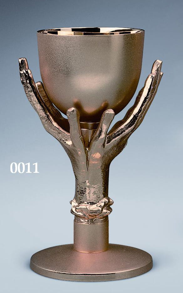 Kielich mszalny mosiężny złocony 24 karatowym złotem. Stojan kielicha to dłonie utrzymujące czarę kielicha