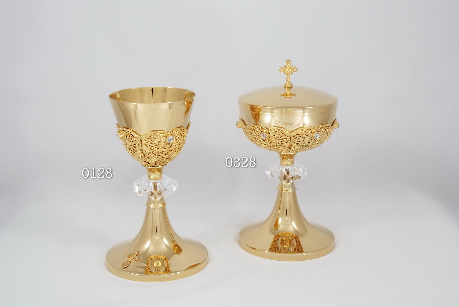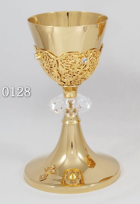 Osobliwy kielich mszalny mosiężny z kryształowym nodusem. Czara kielicha ozdobiona delikatnym ażurowym koszyczkiem i kryształami Swarovskiego. Krzyż u podstawy kielicha na ramionach również posiada kryształy szlifowane. Kielich złocony 24-karatowym złotem.