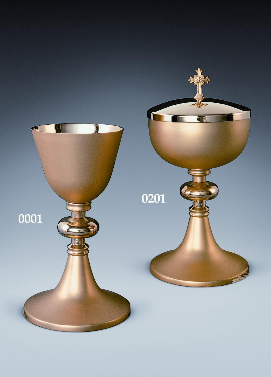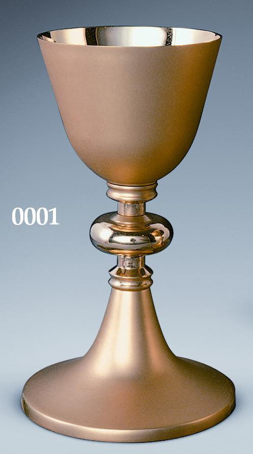 Kielich mszalny z medalionami, mosiężny, złocony 24-karatowym złotem. Nodus z czerwonymi kamieniami. Na podstawie kielicha zaprojektowano medaliony z wizerunkiem czterech Ewangelistów.