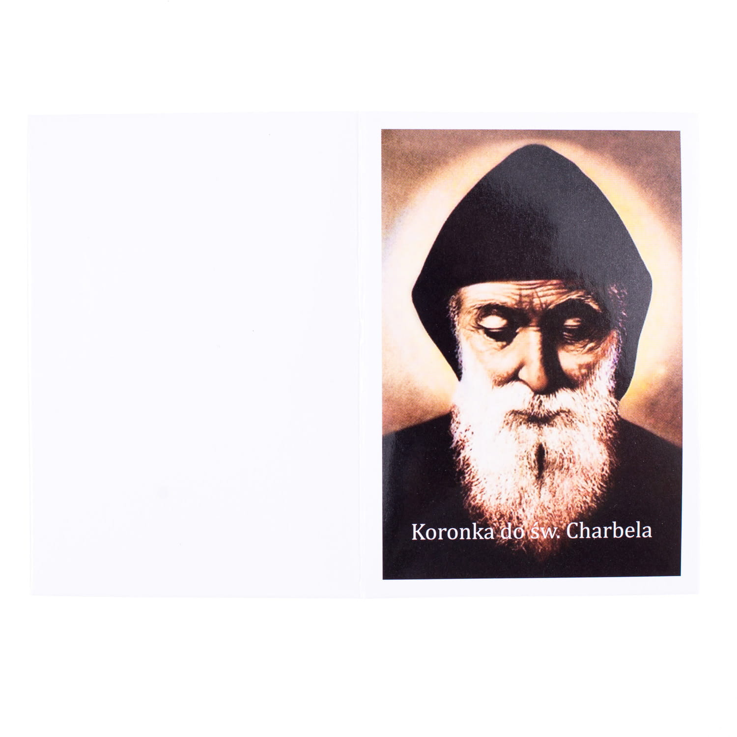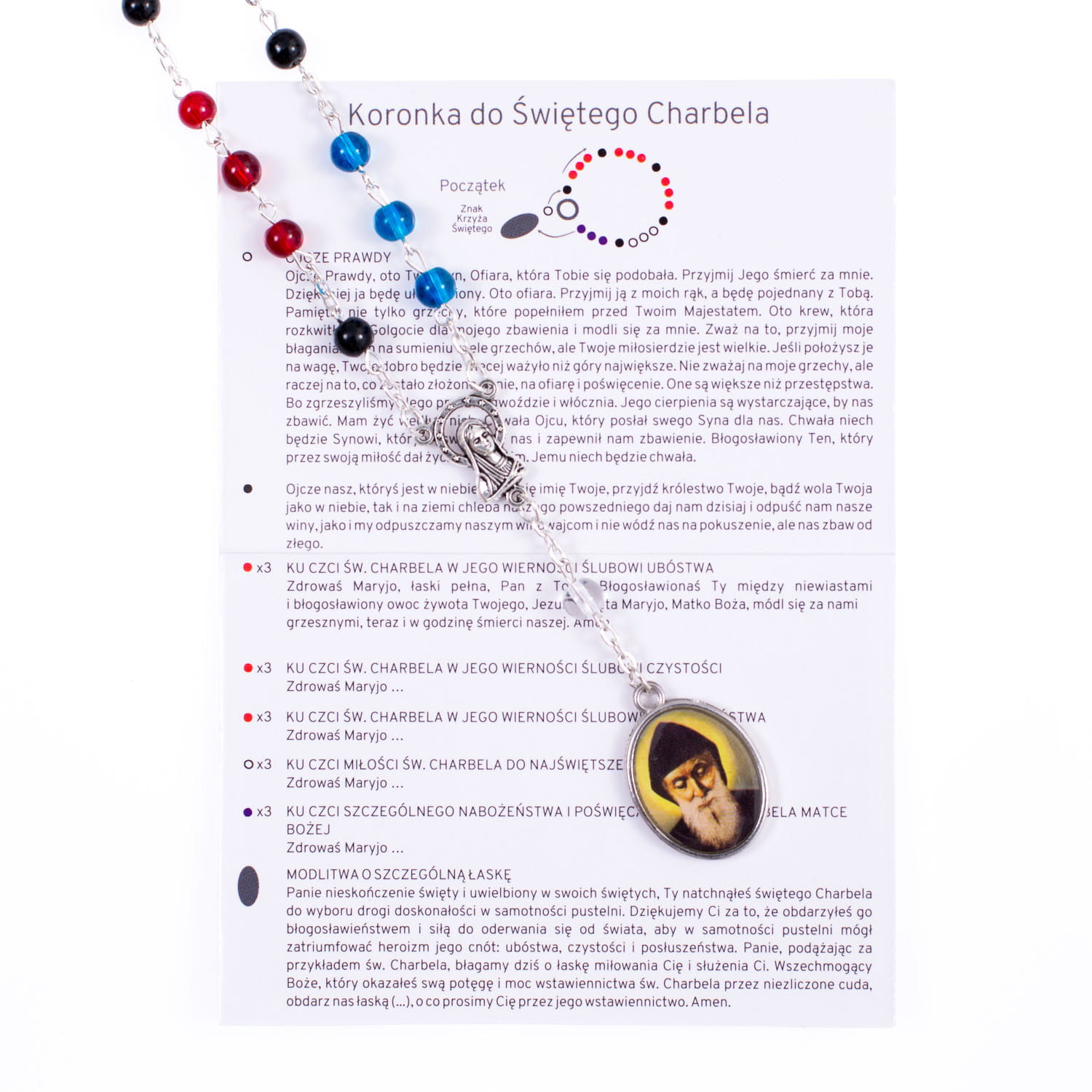 Koronka do św Charbela. Szklane transparentne koraliki w kolorze niebieskim, czarnym i czerwonym. Medalik z wklejką św. Charbela . Elementy metalowe ze stali nierdzewnej. Medalion Matki Boskiej w kolorze starego srebra.
