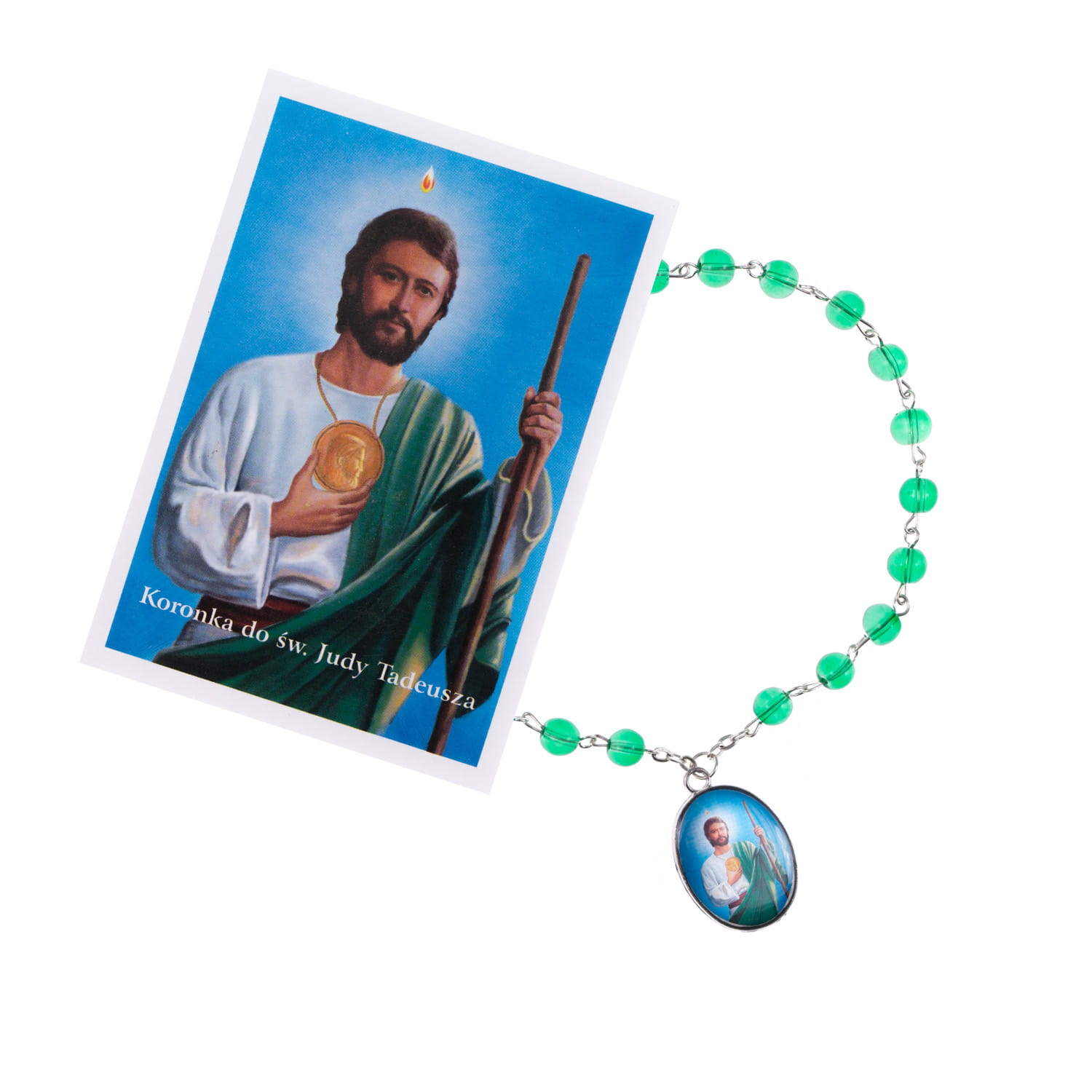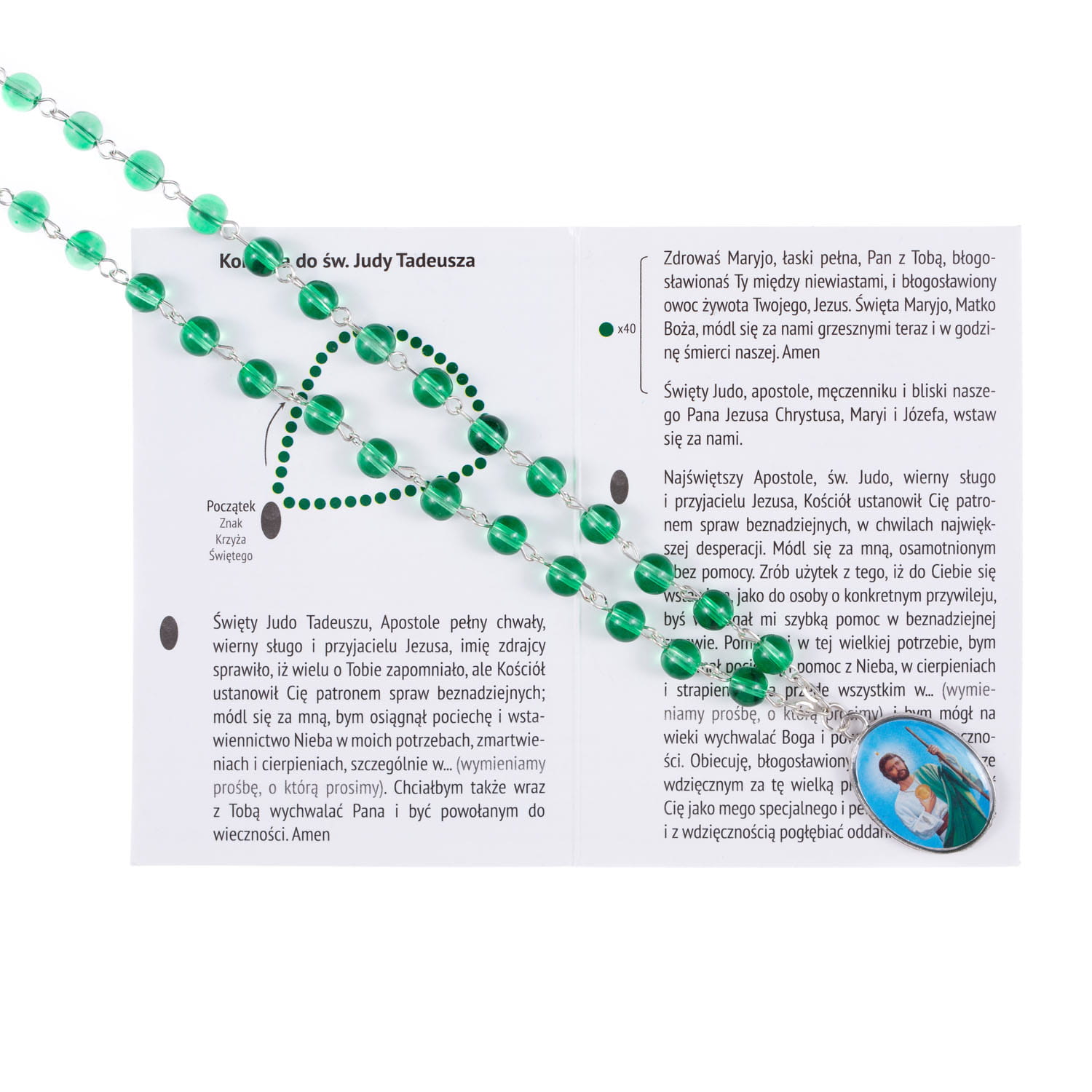 Koronka do św. Tadeusz Judy. Szklane transparentne koraliki w kolorze zielonym. Medalik z wklejką św, Tadeusza Judy. Elementy metalowe ze stali nierdzewnej.