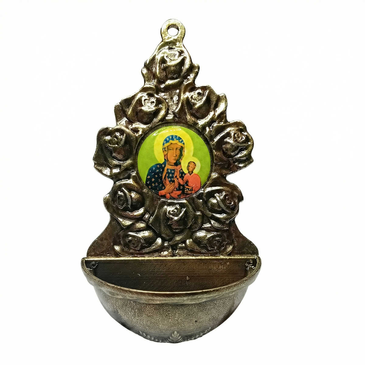 Kropielniczka domowa wykonana z metalu w kolorze starego mosiądzu to solidny i estetyczny element wyposażenia religijnego domu. Klasyczne wykończenie w odcieniu patynowanego mosiądzu nadaje jej szlachetny, tradycyjny charakter. W centralnej części znajduje się wklejka żywiczna z wizerunkiem Matki Bożej Częstochowskiej, jednej z najważniejszych ikon maryjnych w polskiej tradycji katolickiej, będącej symbolem opieki i duchowego wsparcia.