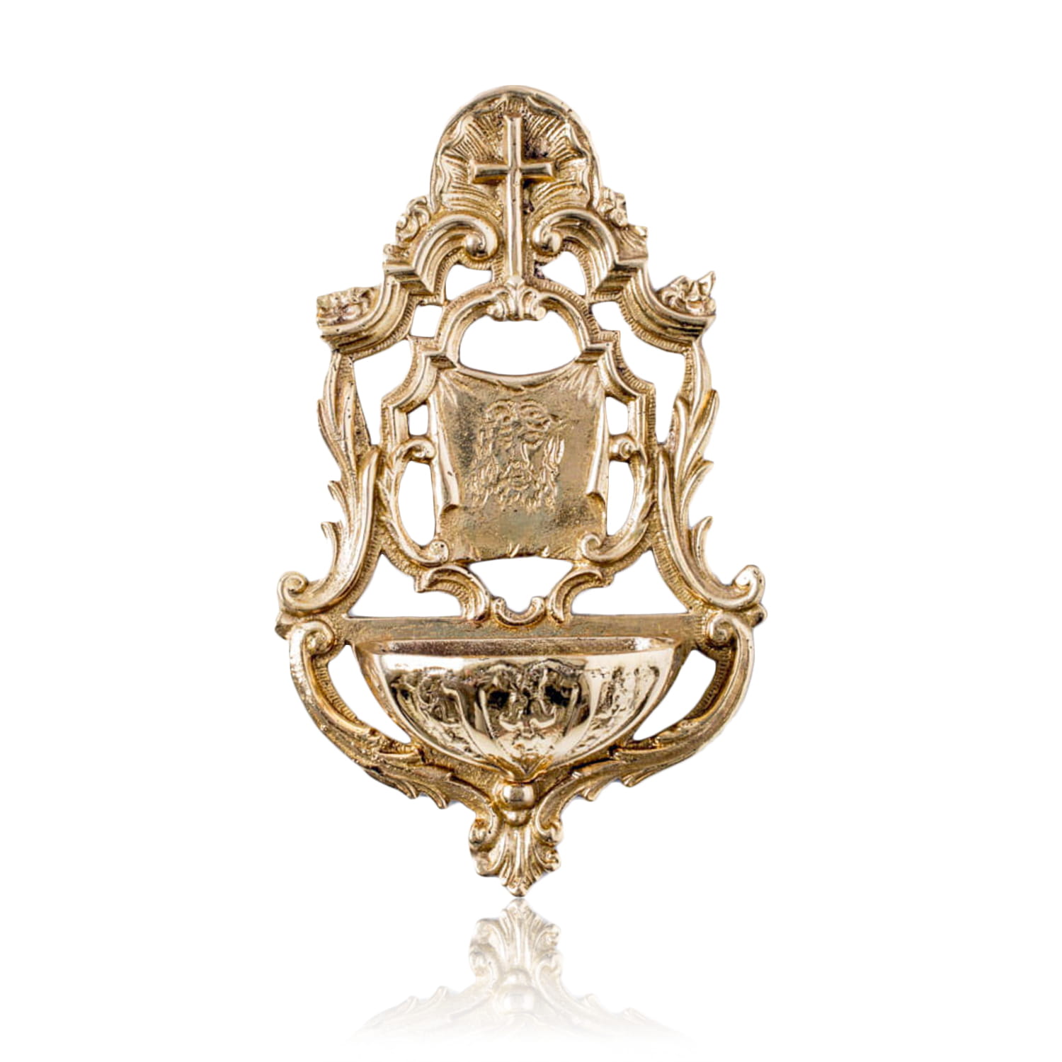 Ażurowa kropielnica z twarzą Jezusa Chrystusa na chuście świętej Weroniki zwieńczona krzyżem chrześcijańskim. To naczynie do wody święconej wykonane jest z mosiądzu, polerowane na połysk oraz zabezpieczone lakierem ochronnym. Kropielnica do zawieszenia. Doskonale nadaje się jako kropielnica domowa.