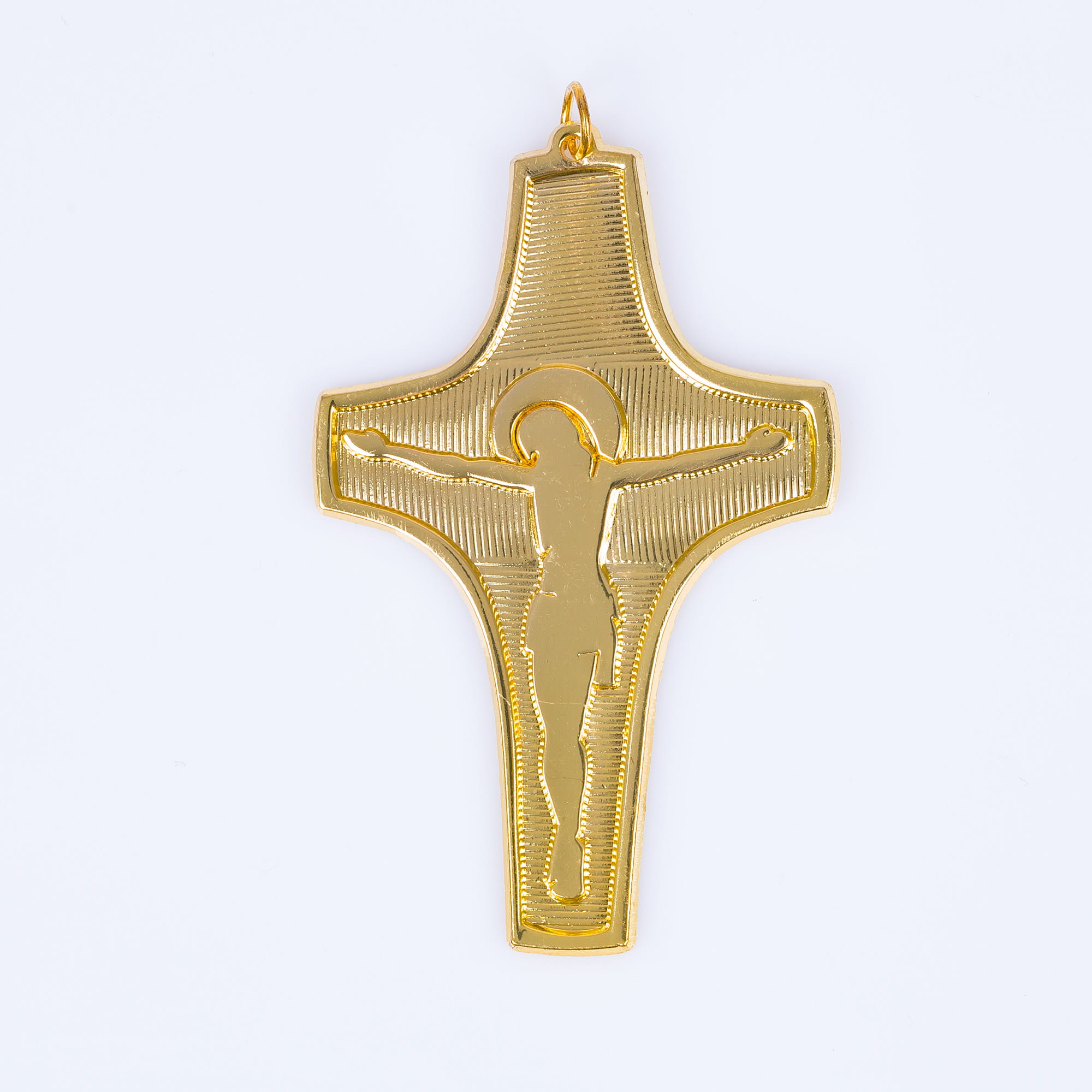 Krzyżyk metalowy, odlew. Krzyżyk z zawieszką. Można dopiąć np. do kluczy, nawlec na rzemyk lub sznurek, zawiesić na ścianę itp. Krzyżyk wykończony jest na złoty kolor z wizerunkiem Pana Jezusa. Pozostała powierzchnia krzyżyka metalowego ozdobiona tarką liniową.