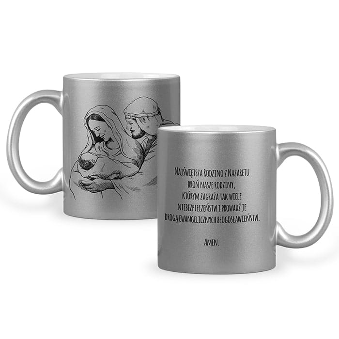 Najwyższej klasy ceramiczny kubek z wizerunkiem Świętej Rodziny odporny na mycie w zmywarce z trwałym nadrukiem oraz złotą lub srebrną metaliczną powierzchnią do wyboru.