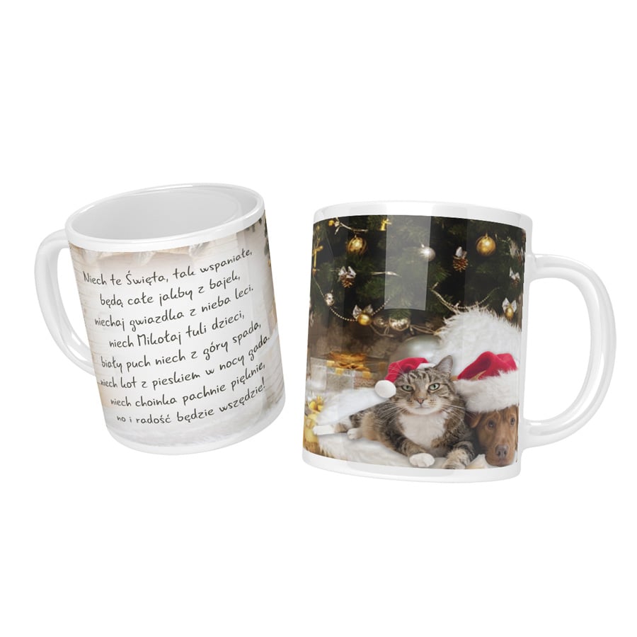 Kubek na Boże Narodzenie z psem i kotem oraz życzeniami świątecznymi, pojemność 330 ml.