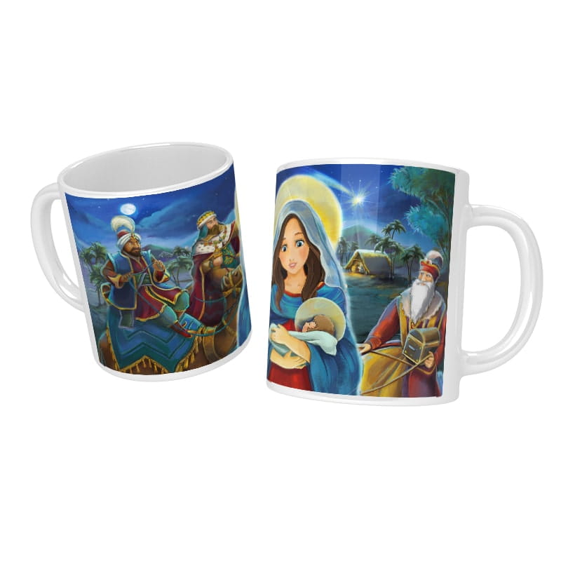 Kubek ze Świętą Rodziną na Boże Narodzenie i życzeniami, pojemność 330 ml. Najwyższej klasy ceramiczny kubek odporny na mycie w zmywarce z trwałym nadrukiem i nieblednącymi kolorami.