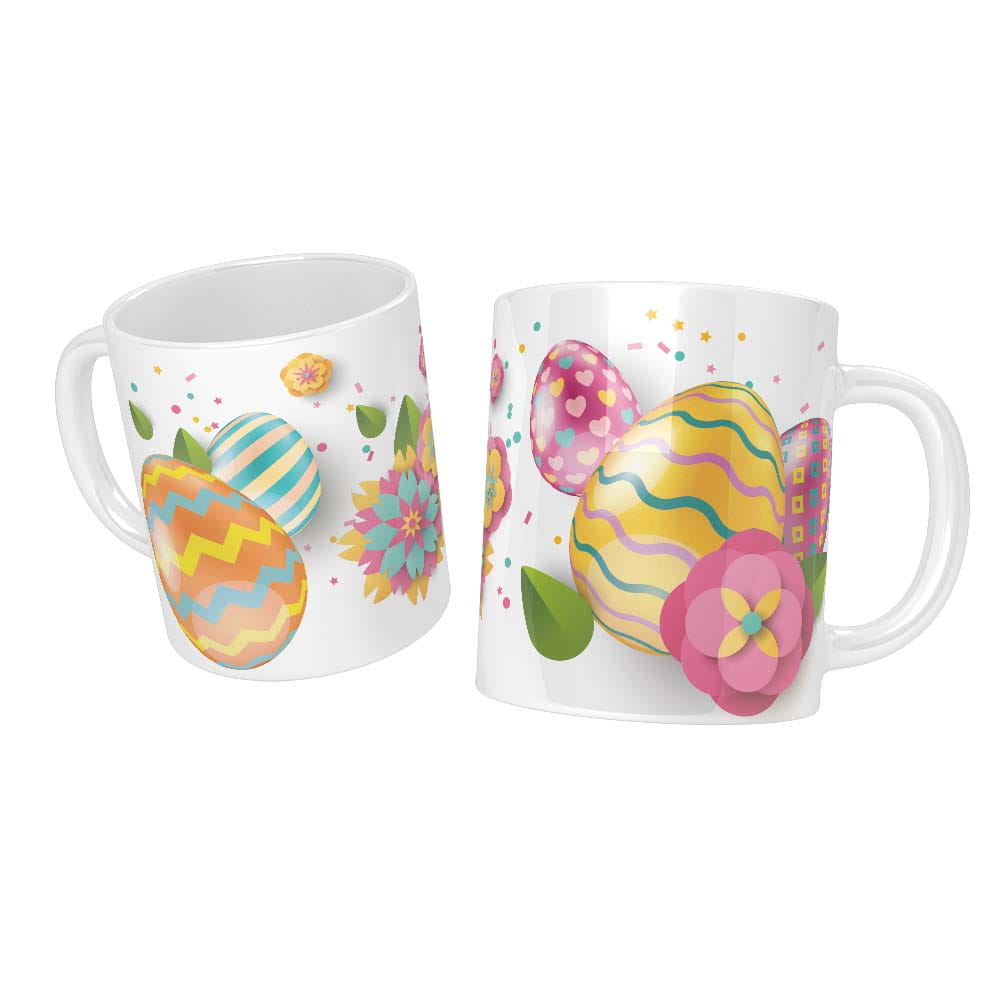 Biały kubek z motywem wielkanocnym o pojemności 330 ml. Najwyższej klasy AAA+ ceramiczny kubek odporny na mycie w zmywarce z trwałym nadrukiem i nieblednącymi kolorami.