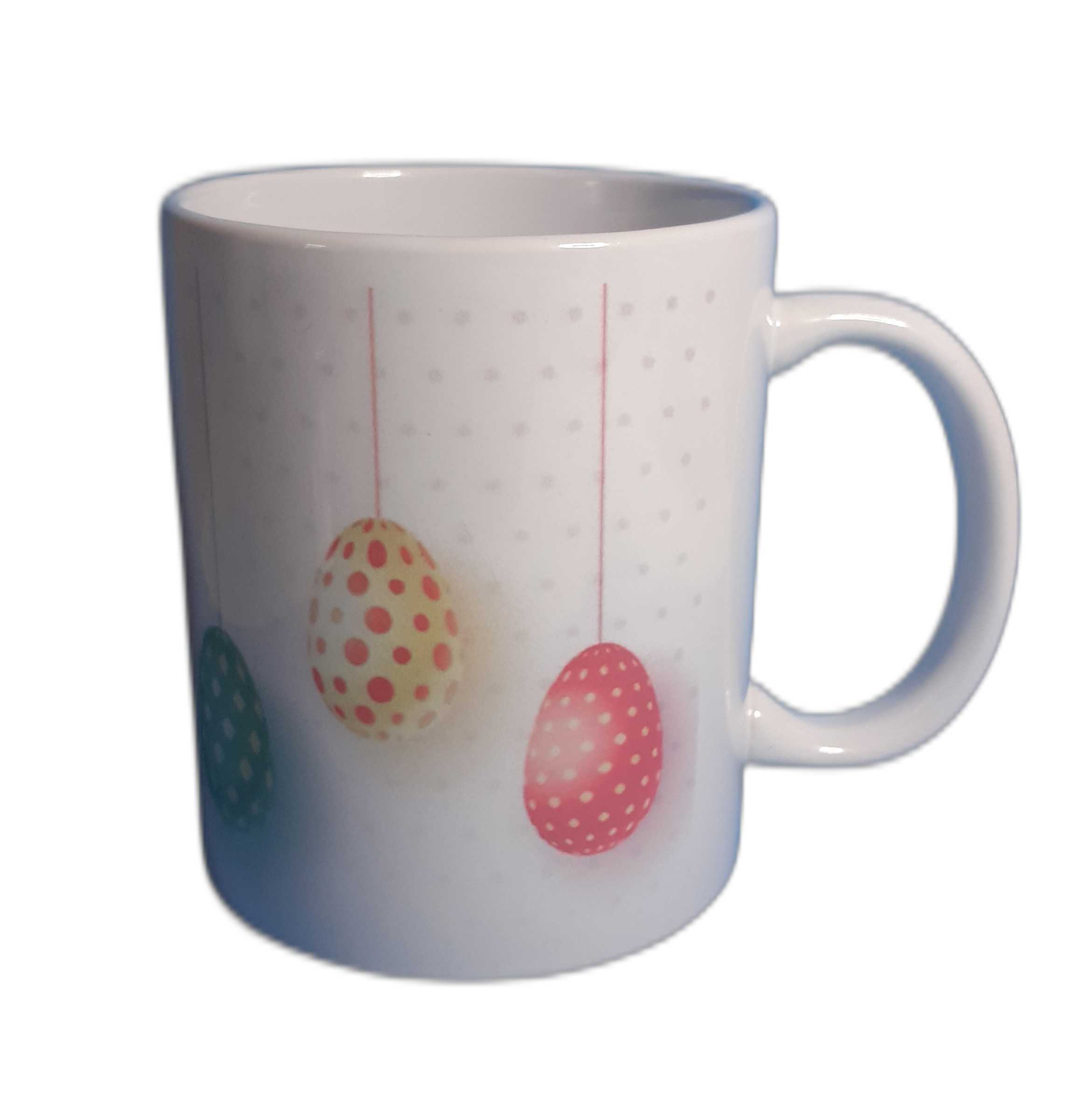 Biały kubek z motywem wielkanocnym o pojemności 330 ml. Najwyższej klasy AAA+ ceramiczny kubek odporny na mycie w zmywarce z trwałym nadrukiem i nieblednącymi kolorami.