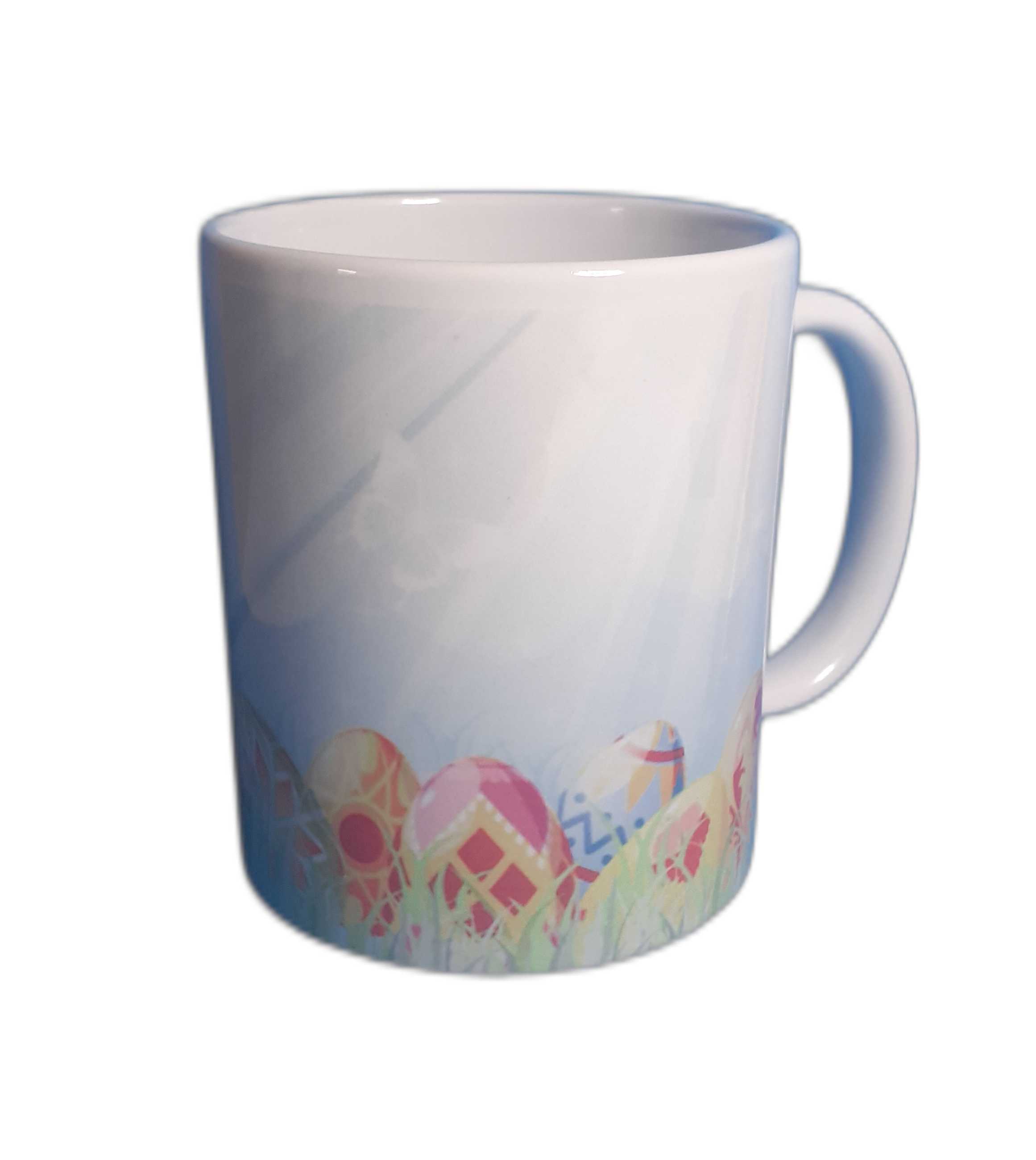 Biały kubek z motywem wielkanocnym o pojemności 330 ml. Najwyższej klasy AAA+ ceramiczny kubek odporny na mycie w zmywarce z trwałym nadrukiem i nieblednącymi kolorami.