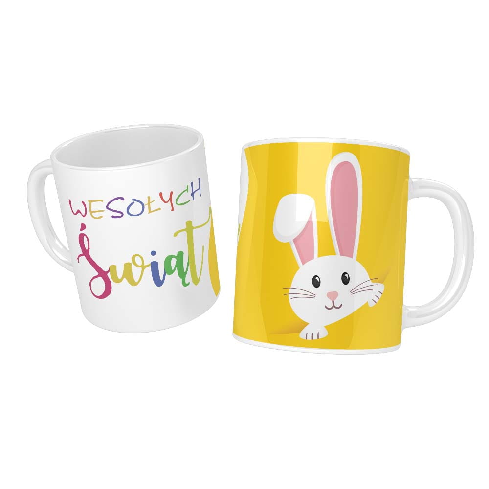 Biały kubek z motywem wielkanocnym o pojemności 330 ml. Najwyższej klasy AAA+ ceramiczny kubek odporny na mycie w zmywarce z trwałym nadrukiem i nieblednącymi kolorami.