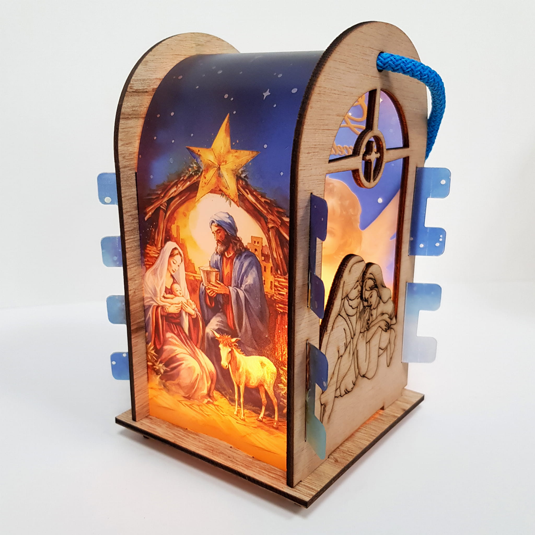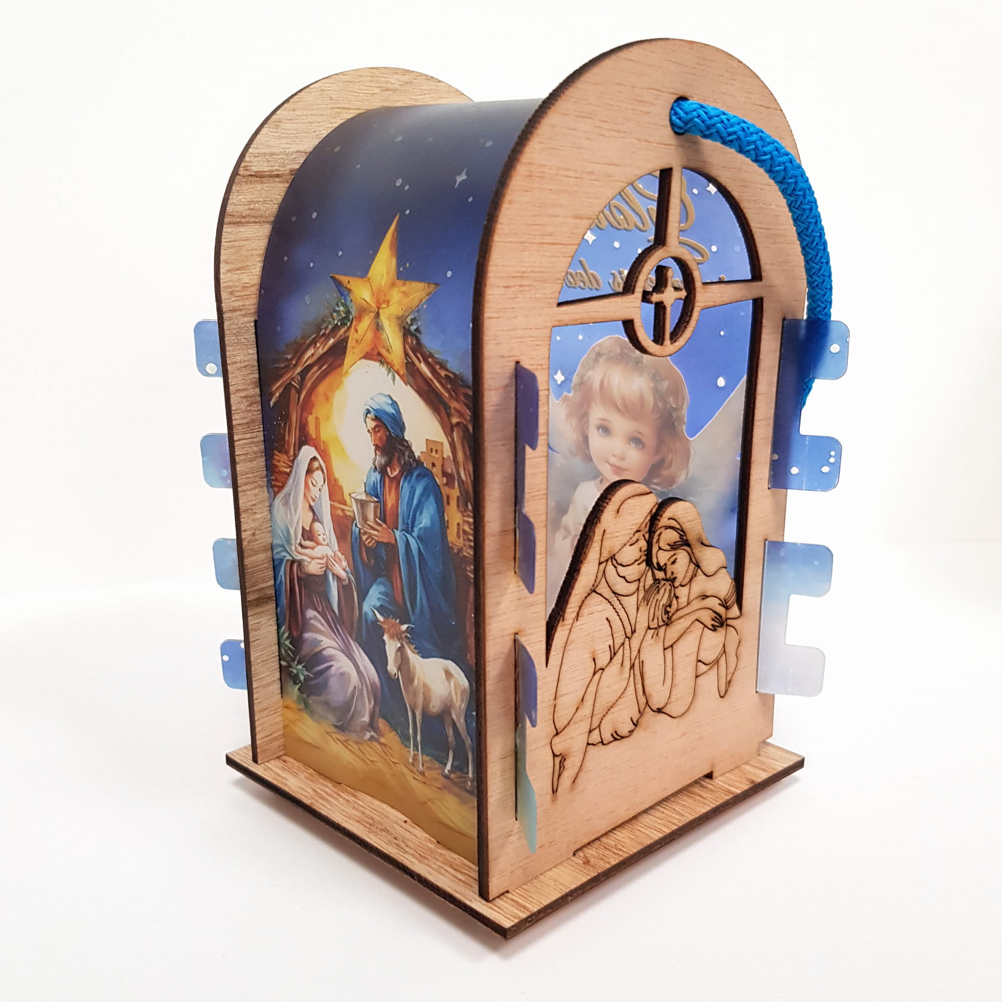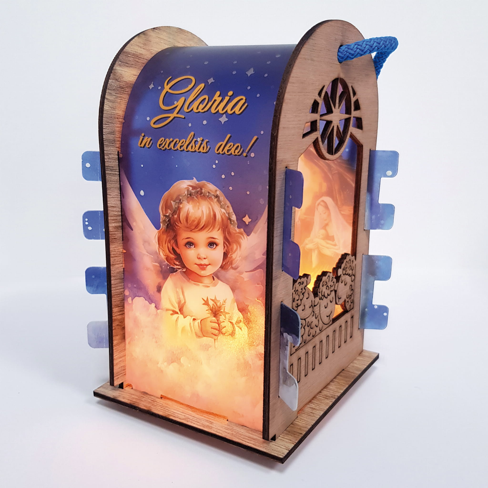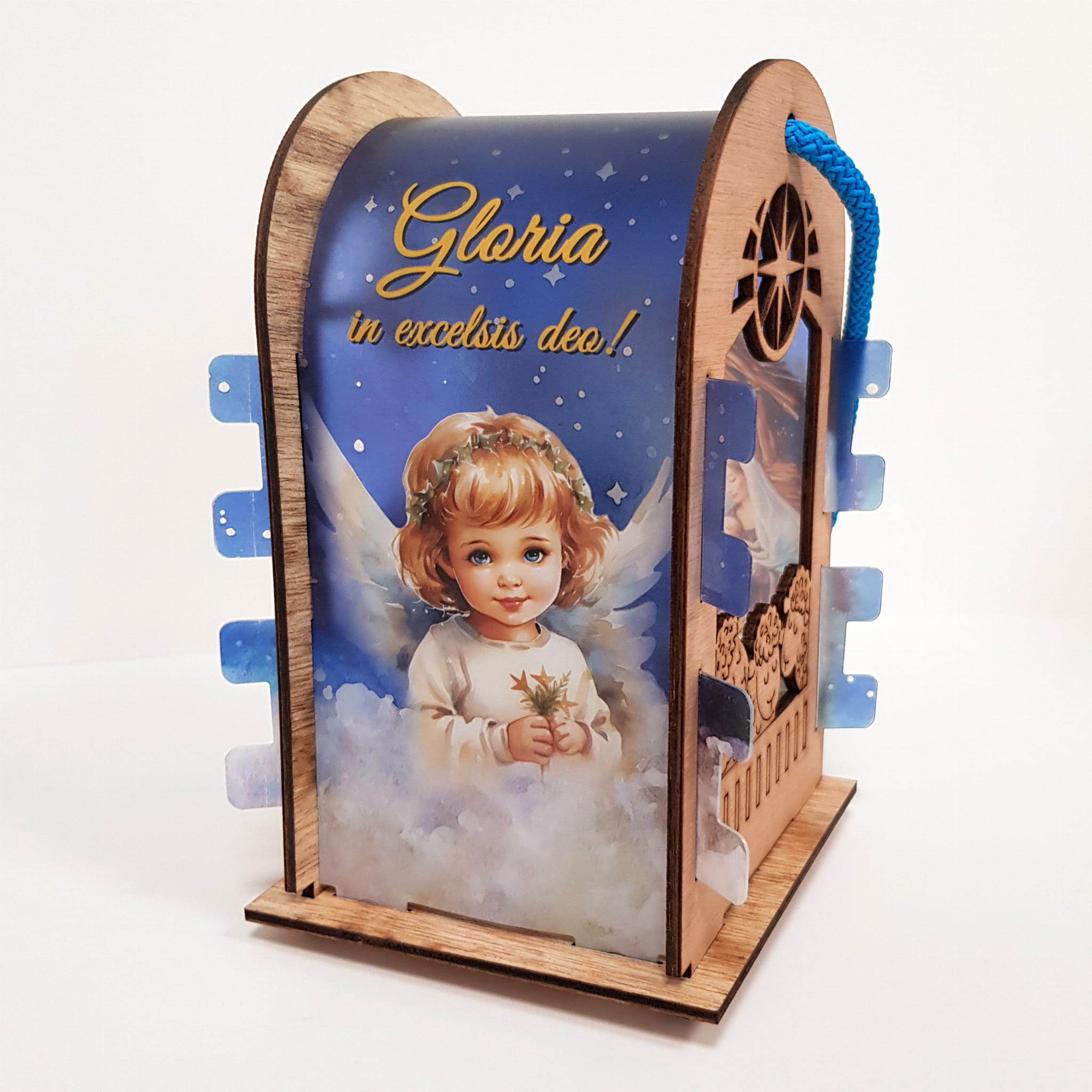 Lampion adwentowy ze sklejki brzozowej z wstawką z tworzywa sztucznego na której znajduje się aniołek na chmurce. Górna część lampionu wykończona półłukiem na wzór kapliczki. Światełko led imituje blask świecy (drgający płomień). Uchwyt lampionu to ozdobny gruby sznurek. Lampion jest lekki z przeznaczeniem do noszenia dla dzieci jak i do ozdoby np. zawieszenie na choince.