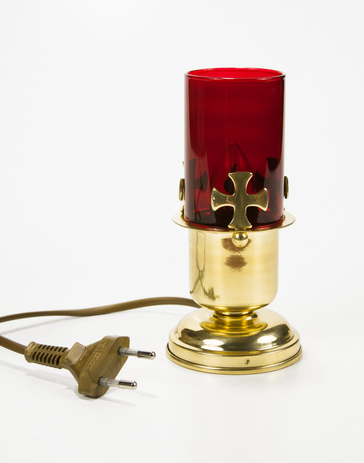 Stojąca lampka elektryczna wykonana z mosiądzu. Klosz w kolorze czerwonym wykonanym ze szkła. Przewód zasilający lampkę z włącznikiem. Lampka sprzedawana jest z żarówką zwykłą.