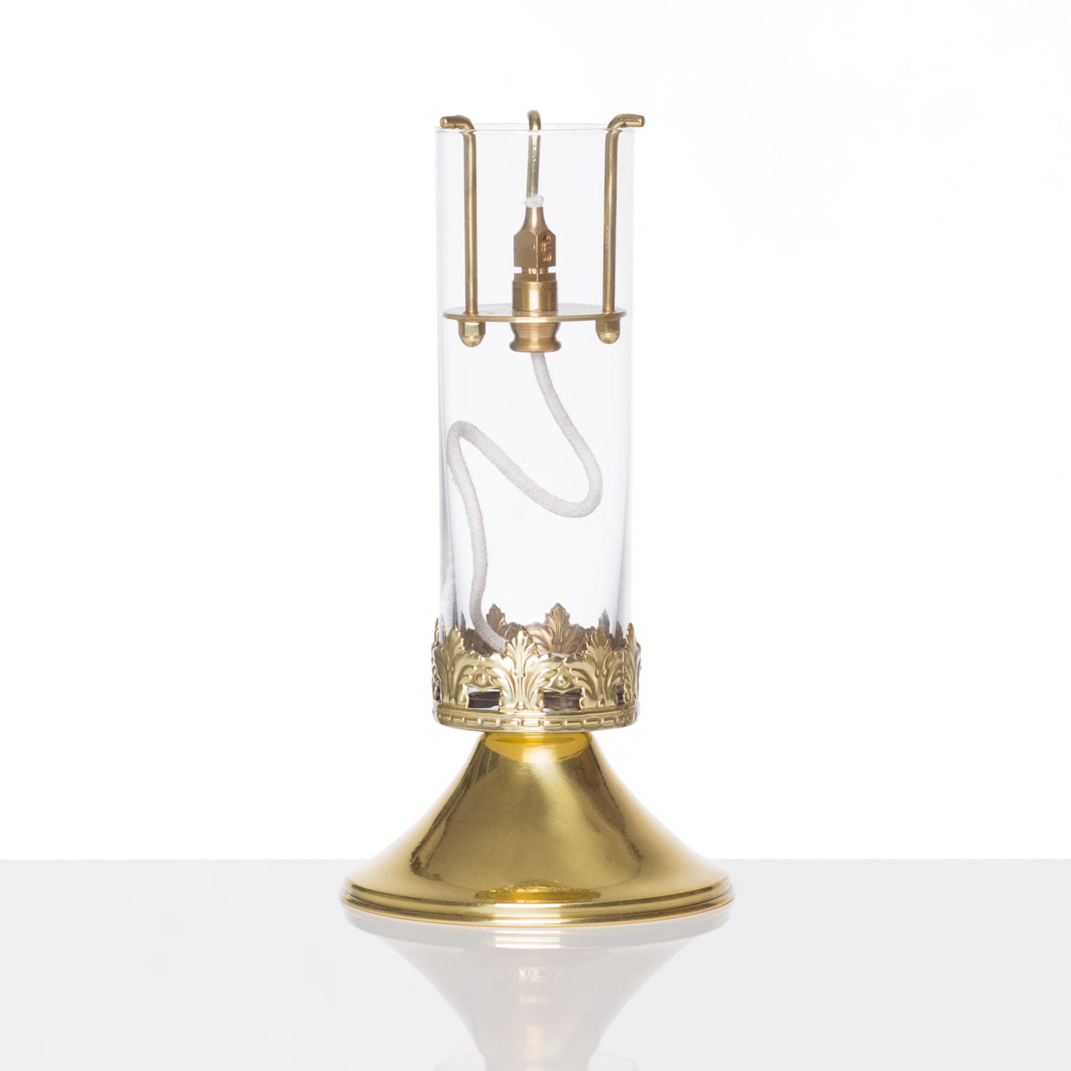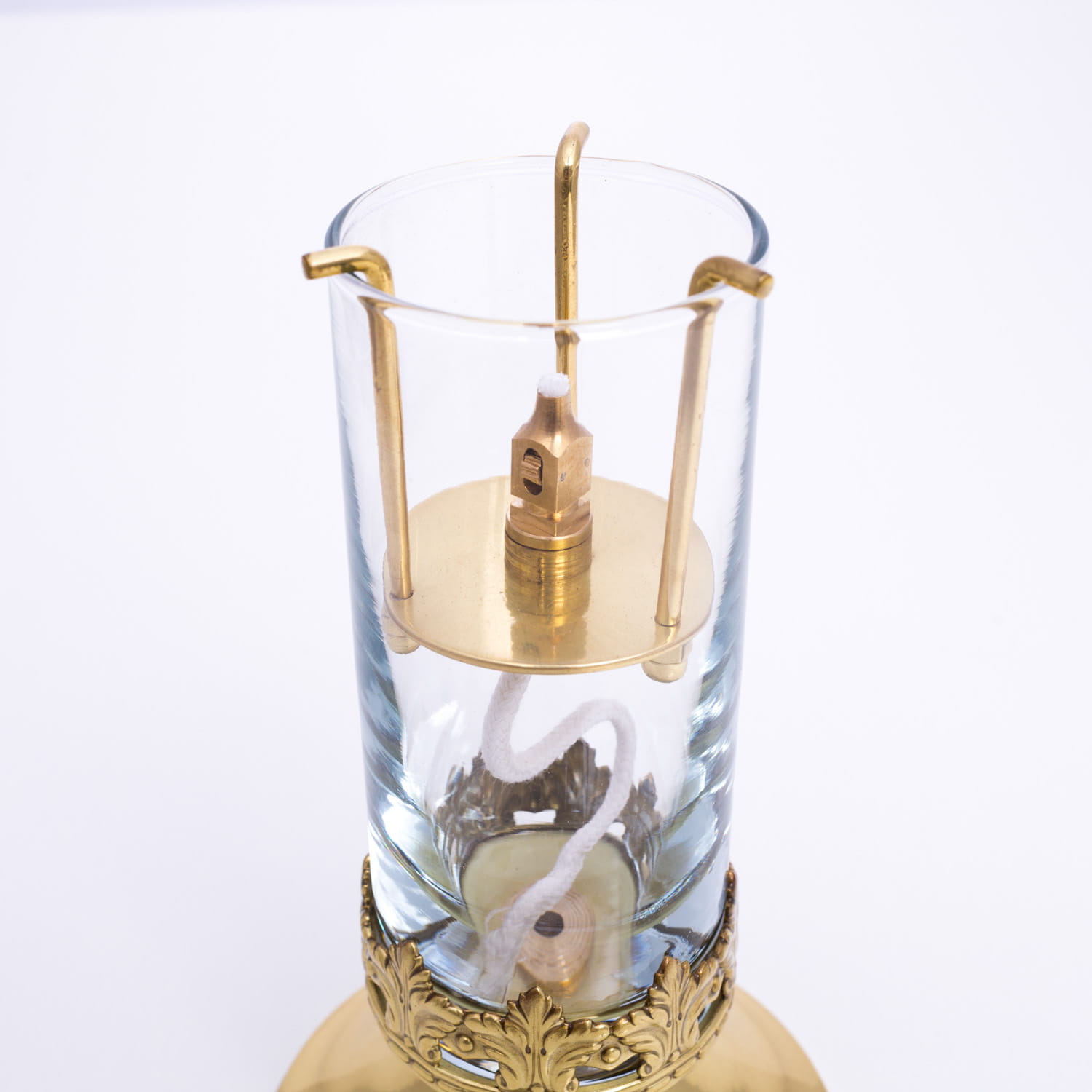 Lampka olejowa z możliwością regulacji długości knota. Bezbarwny klosz bez zdobień.