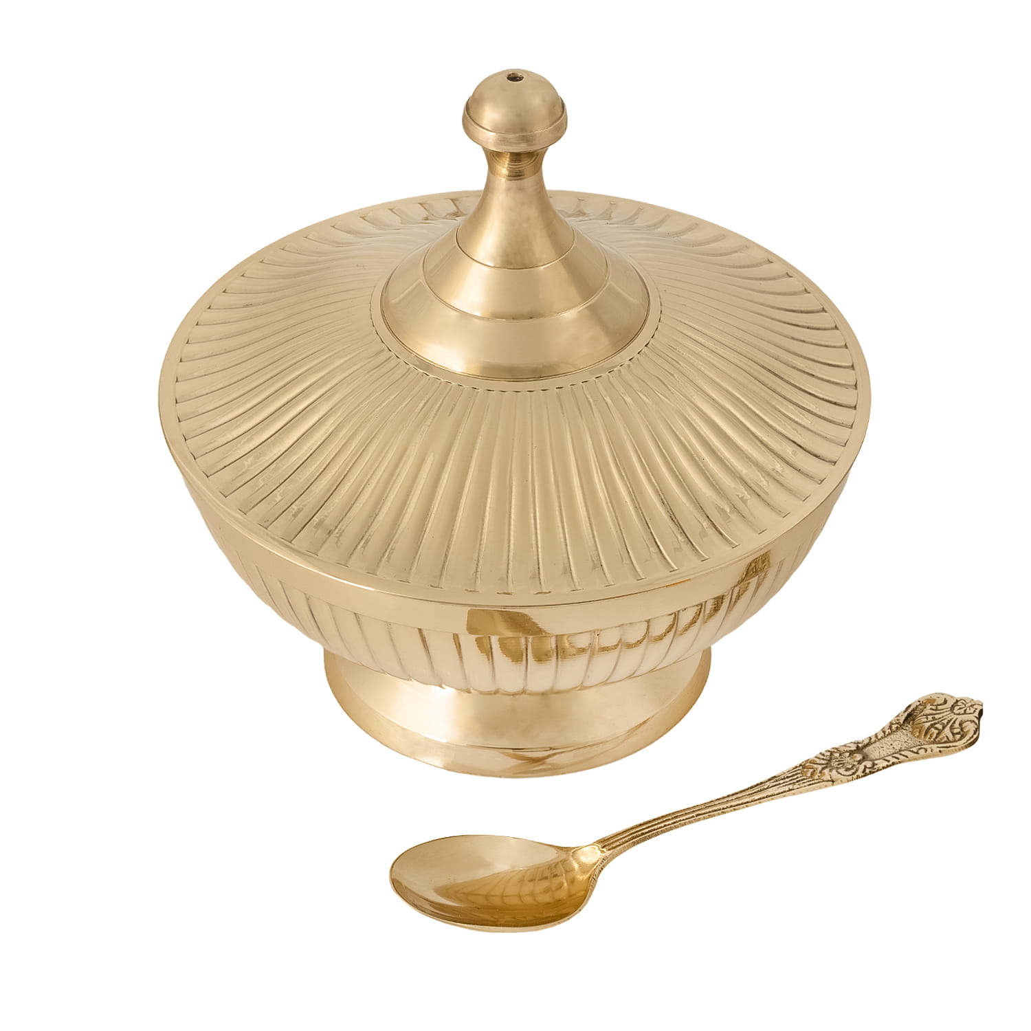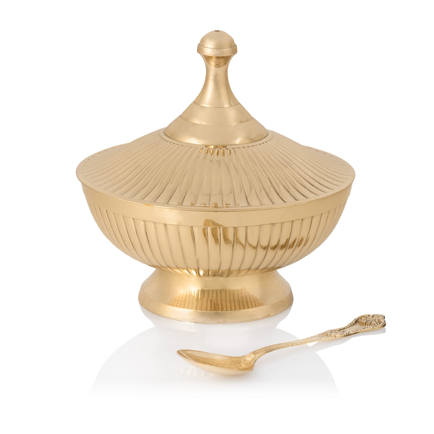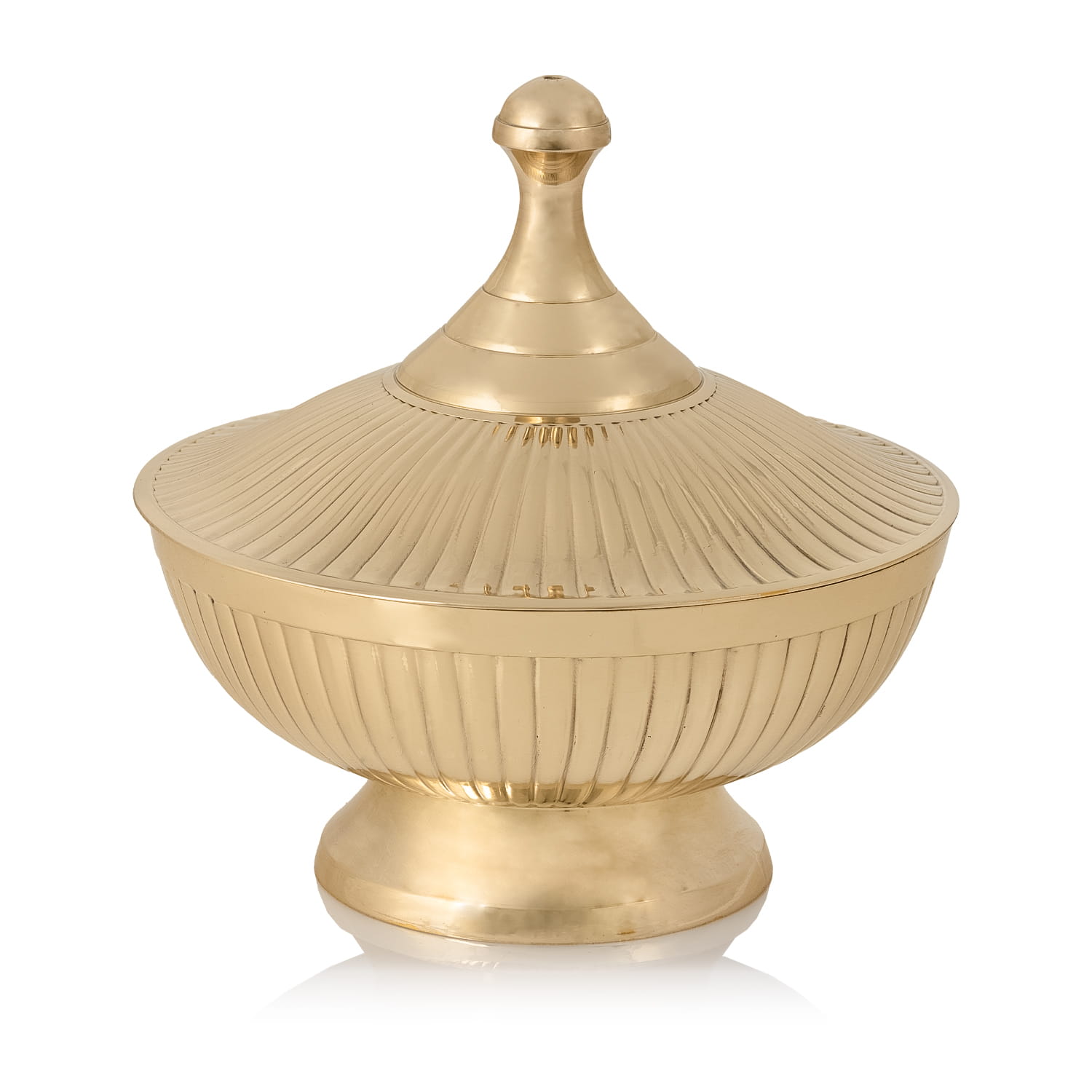Pokrywka w formie stożkowej kopuły z ozdobnym uchwytem chroni kadzidło przed rozsypaniem i wpływem czynników zewnętrznych. Delikatne żłobienia w promienistym układzie podkreślają jej estetykę.