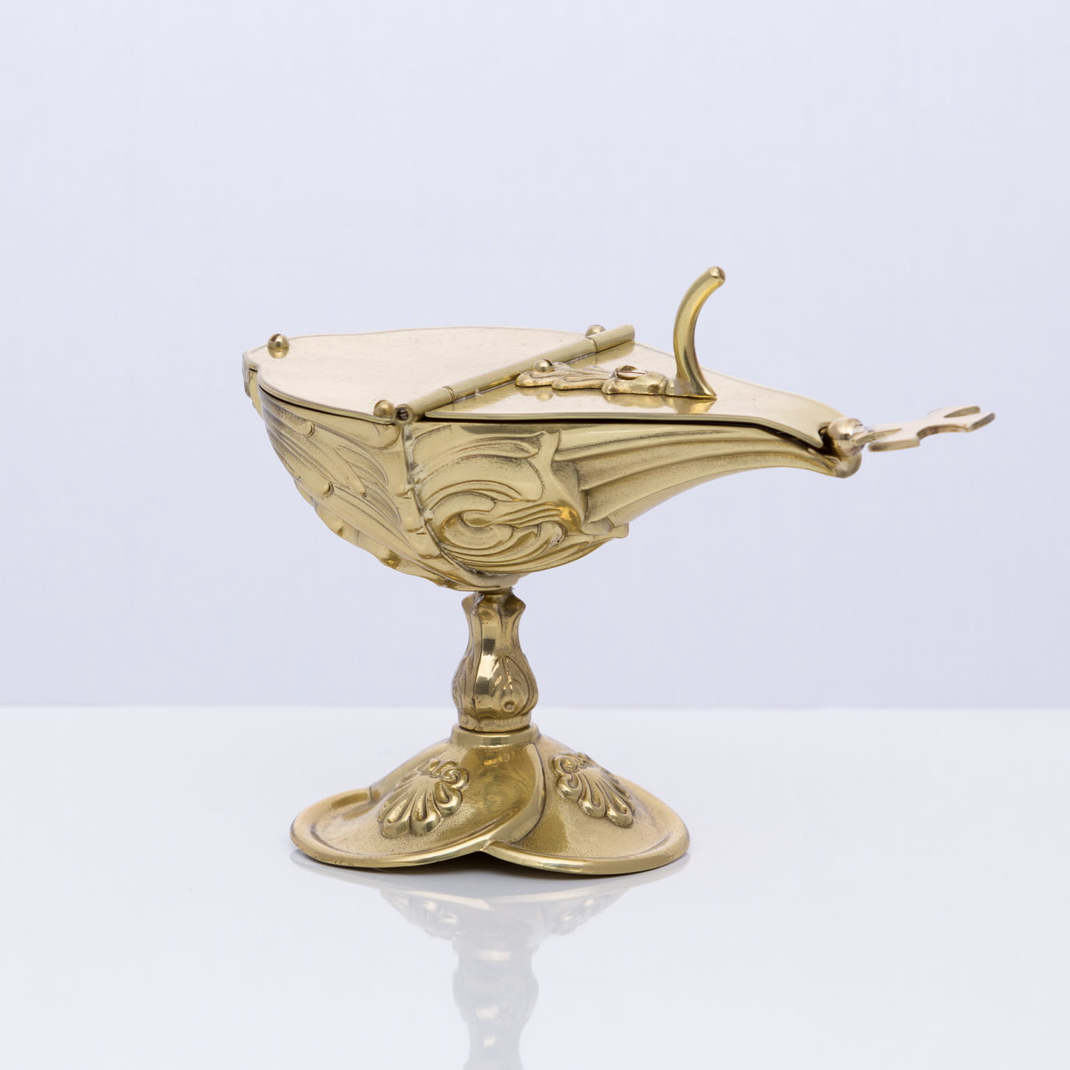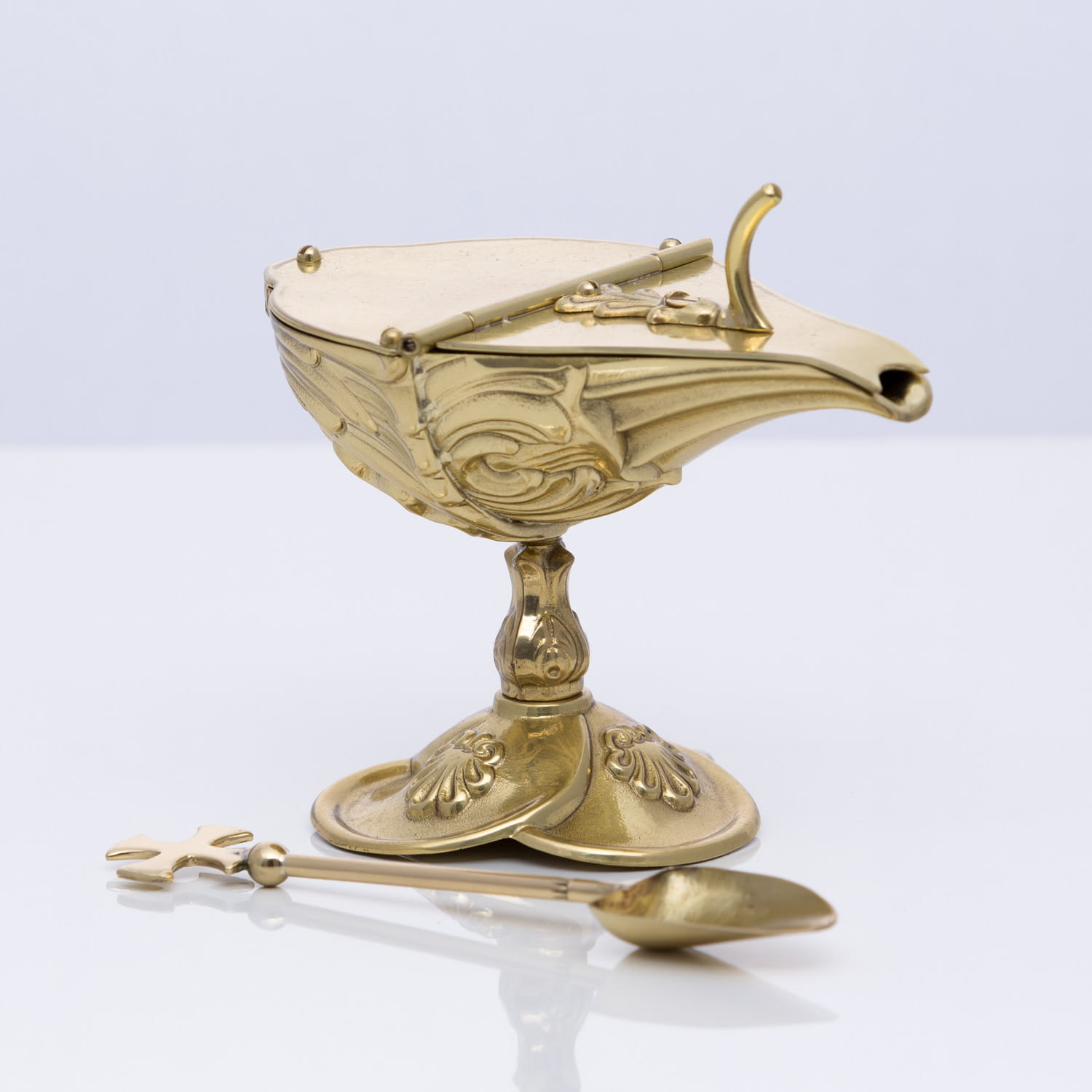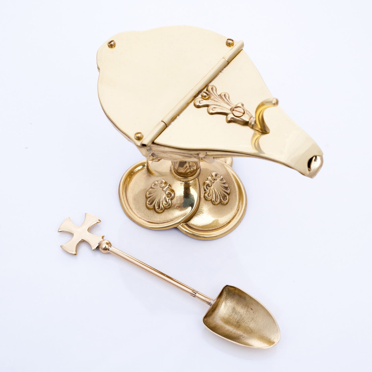 Mosiężna łódka z łyżeczką wykonana z włoskich odlewów, gustownie zdobiona. Otwierana na zawiasku z uchwytem do podnoszenia denka. Zabezpieczona proszkowym lakierem bezbarwnym.