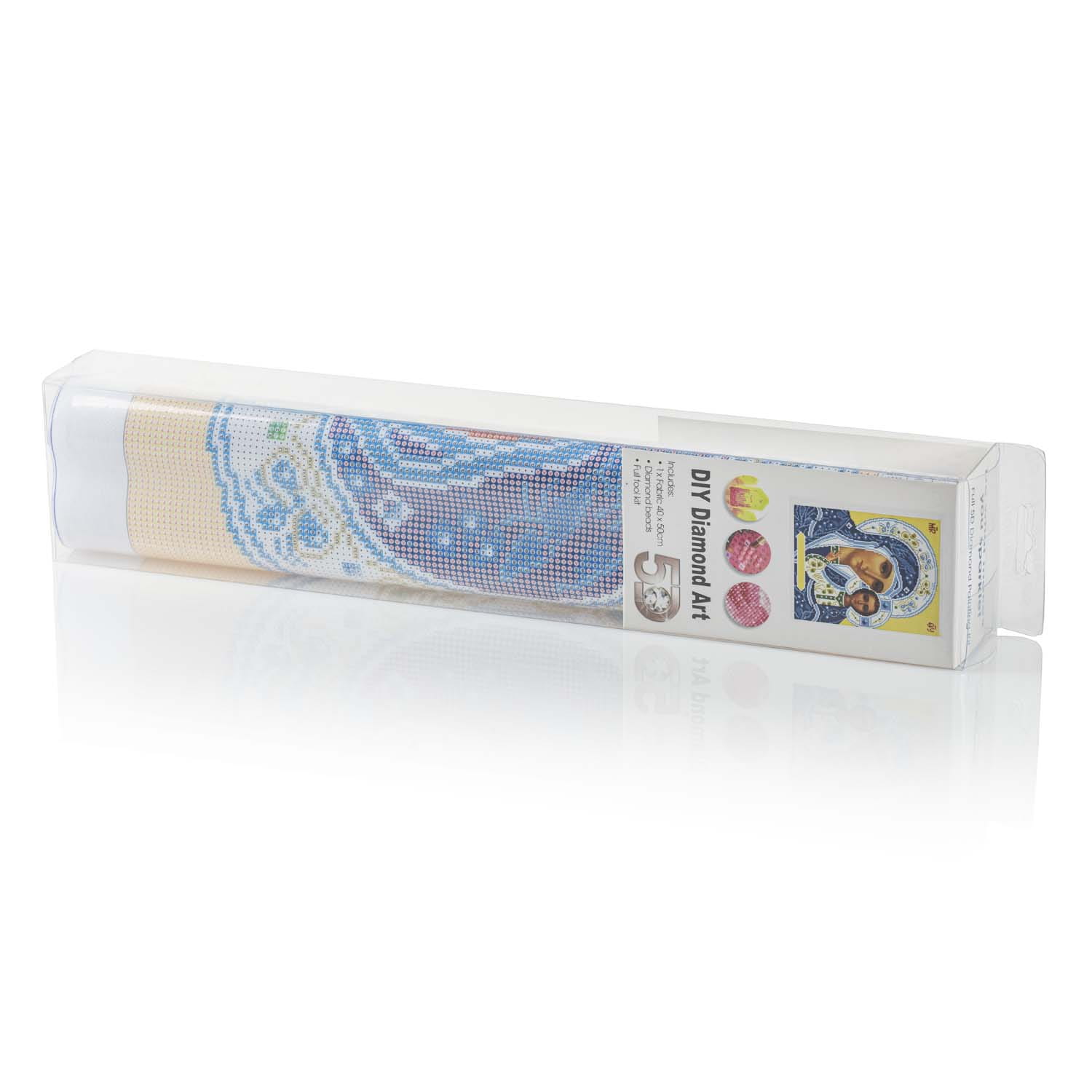 Płótno z nadrukowanym obrazem, pokryte klejem i zabezpieczone folią woreczki z diamencikami, z numerami pozwalającymi na łatwe dopasowanie do symbolu zgodnie z legendą umieszczoną na płótnie