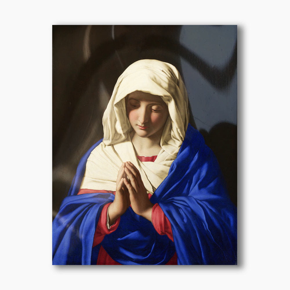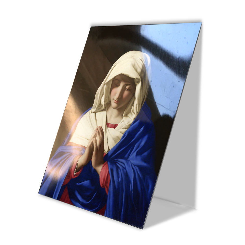 Obraz religijny przedstawiający Matkę Bożą w modlitwie. Obraz wykonany na doskonałej jakości płycie plexi o wysokiej transparentności i zaskakująco żywych barwach. Dzięki użyciu plexi obraz posiada wrażenie trójwymiarowości.