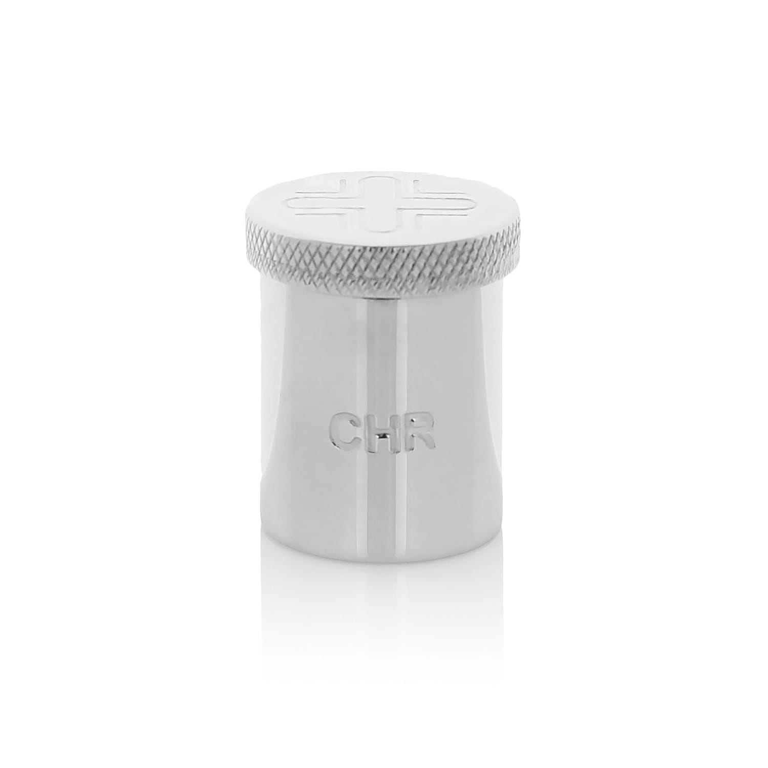 Mosiężny niklowany pojemnik na olej CHR Krzyżmo. Pojemniczek z grawerem na wieczku i symbolem na ściance. Wykończenie pojemnika na połysk.