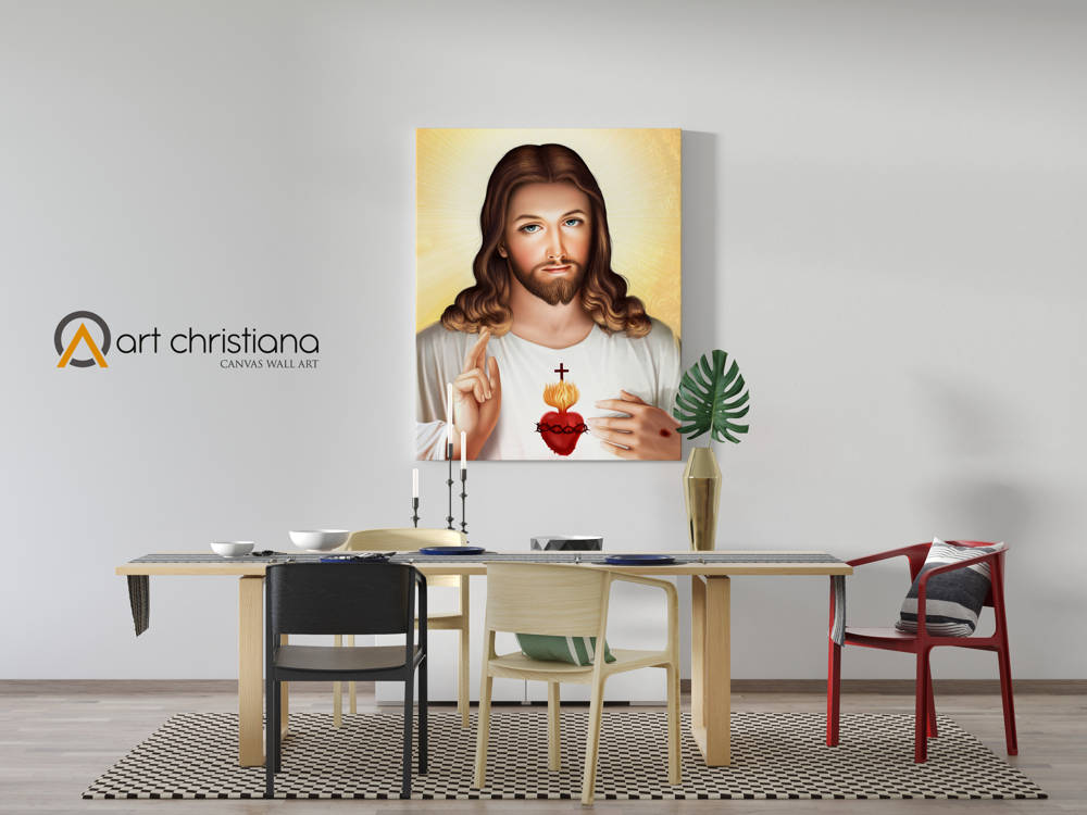 Obraz religijny na płótnie typu canvas przedstawiający jeden z najbardziej znanych wizerunków przedstawiających Serce Jezusa. Obraz religijny na płótnie canvas z wizerunkiem Jezusa z otwartym sercem się może stanowić doskonały prezent, z pewnością wniesie do pomieszczenia ciepło i kolor a także może być pomocą w codziennej modlitwie.