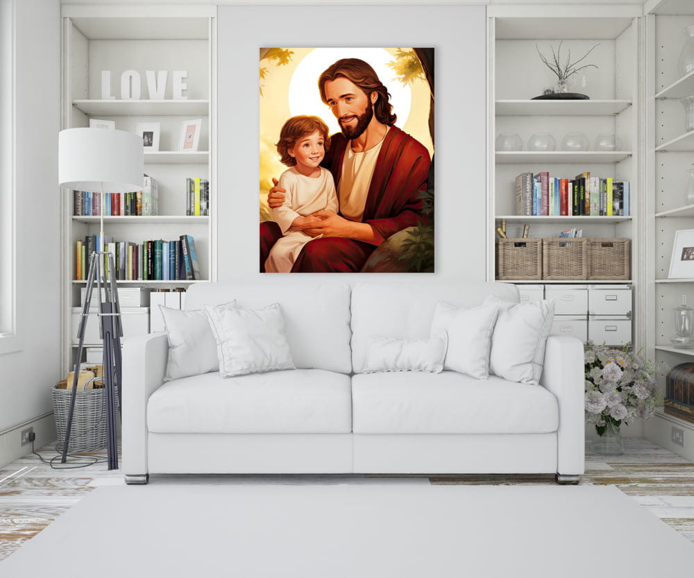 Odkryj głęboką relację między Jezusem a małym chłopcem na naszym wyjątkowym obrazie na płótnie canvas.