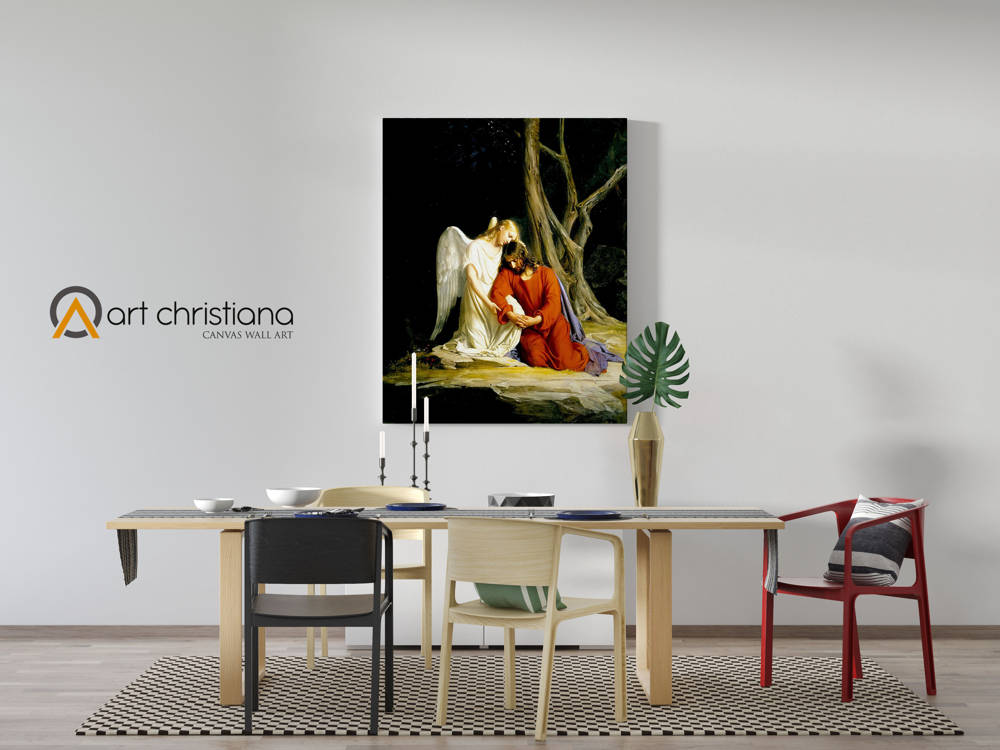 Obraz religijny na płótnie typu canvas przedstawiający Jezusa Chrystusa w Ogrodzie Oliwnym, Getsemani. Obraz religijny na płótnie canvas z wizerunkiem Pana Jezusa modlącego się może stanowić doskonały prezent, z pewnością wniesie do pomieszczenia ciepło i kolor a także może być pomocą w codziennej modlitwie.