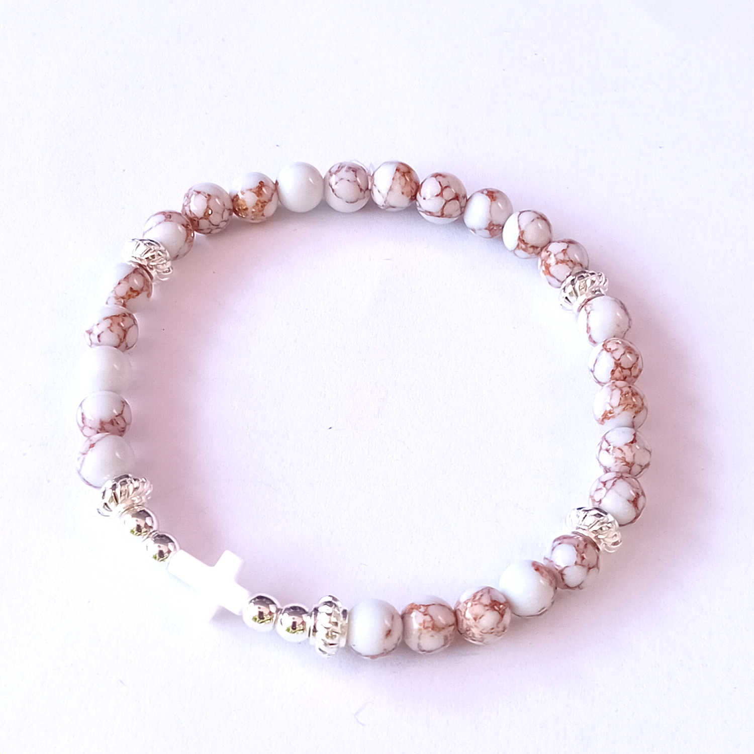 Subtelna i elegancka bransoletka wykonana z naturalnego spoun howlitu – kamienia o jasnej, marmurkowej strukturze z delikatnymi żyłkami. Jej centralnym punktem jest krzyżyk z masy perłowej, będący wyrazem wiary, nadziei i duchowej siły.