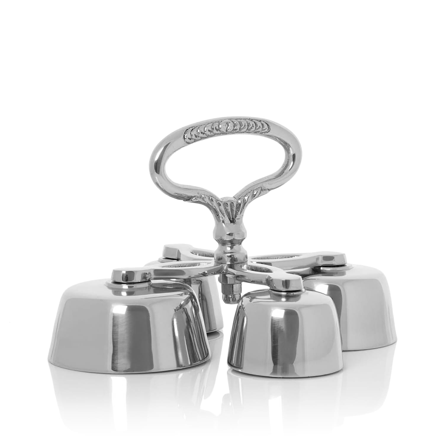 Dzwonki liturgiczne poczwórne. Dzwonki wykonane z mosiądzu i niklowane. Czasze dzwonków wykonane na połysk Odlewy dzwonków są gładkie.