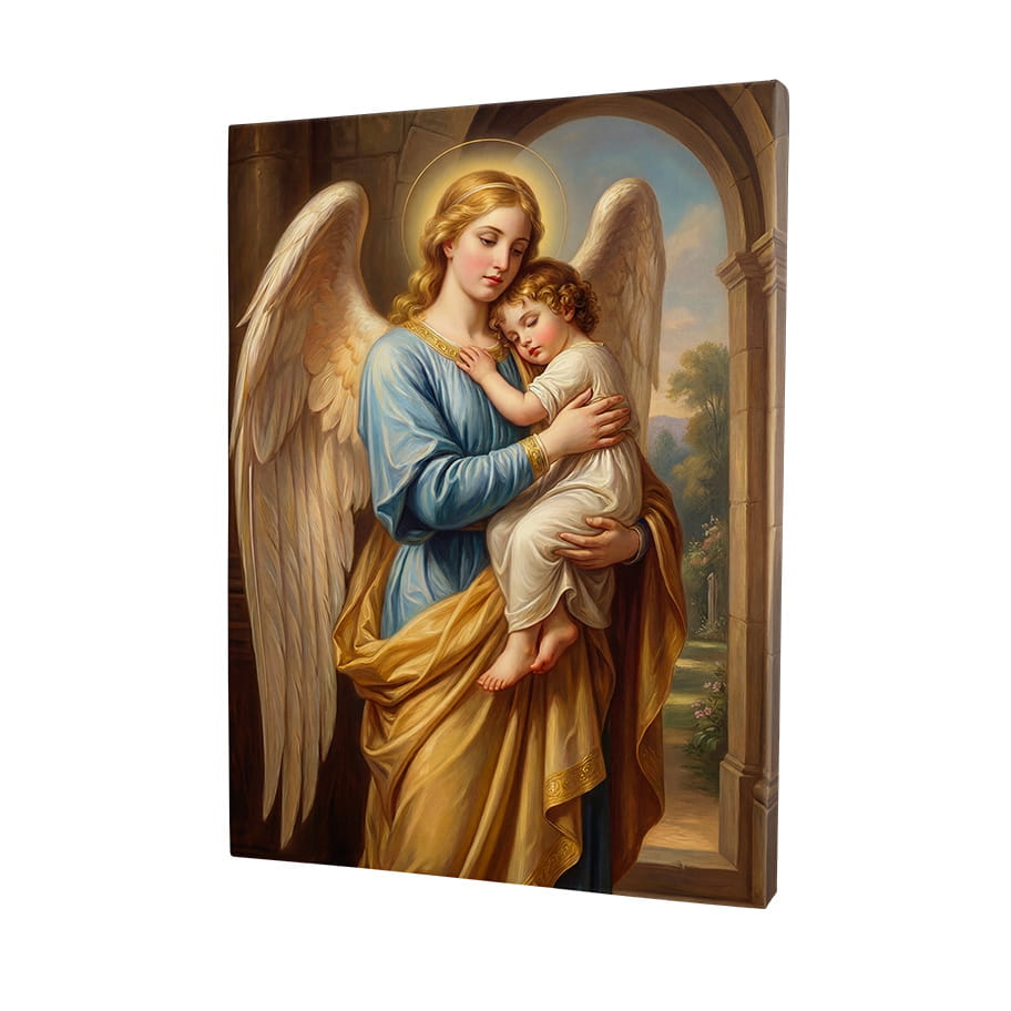 Postać Anioła Stróża od wieków symbolizuje Bożą opiekę, prowadzenie i dyskretną obecność w życiu człowieka. Chłopiec ukazany na obrazie nie jest jedynie dzieckiem – to znak każdego, kto może powierzyć się tej opiece i odnaleźć spokój mimo codziennych trosk. Właśnie dlatego motyw ten tak często wybierany jest do domów rodzinnych i przestrzeni, w których ważna jest atmosfera bezpieczeństwa, harmonii i duchowego ciepła.