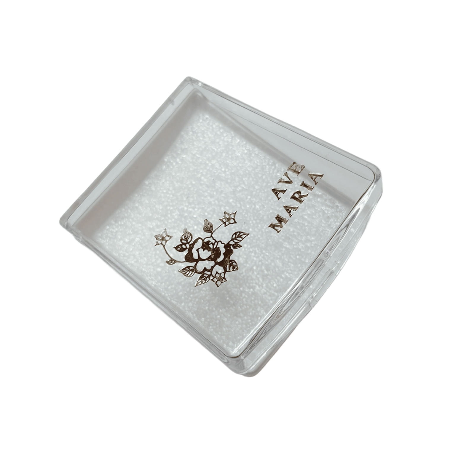 Duże pudełeczko na różaniec wykonane z plastiku z napisem Ave Maria. Wieczko przeźroczyste dół biały. Wieczko pudełeczka otwierane na zawiasku.