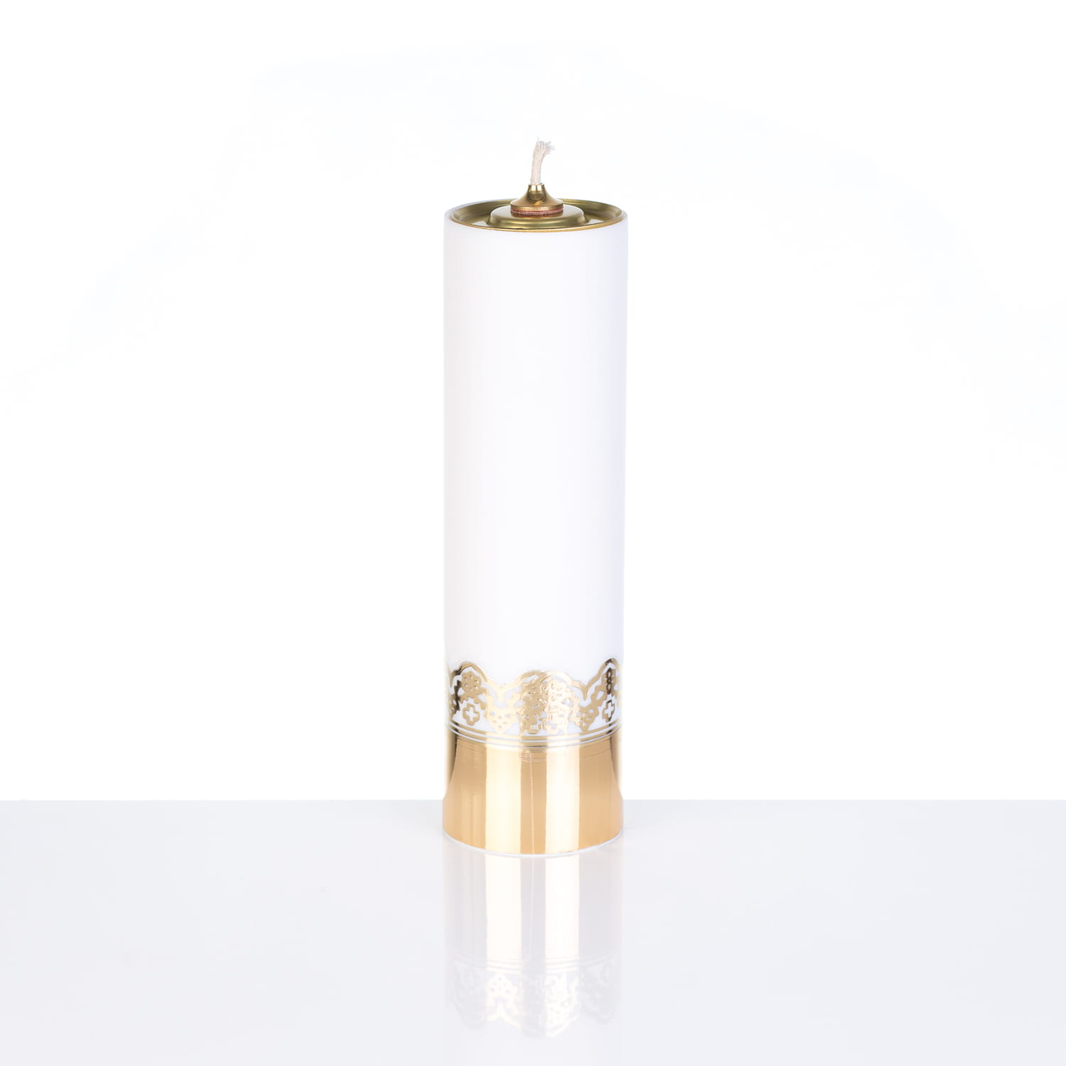 Świeca liturgiczna w kolorze białym z bardzo trwałego tworzywa doskonale imitującego prawdziwą parafinę. Zdobienie w kolorze złotym. Talerzyk oraz chwyt knota wkładu wykonany jest z mosiądzu. Świeca posiada wkład olejowy z regulacją. (knot regulujemy mechanicznie nie ma potrzeby gasić płomienia ).