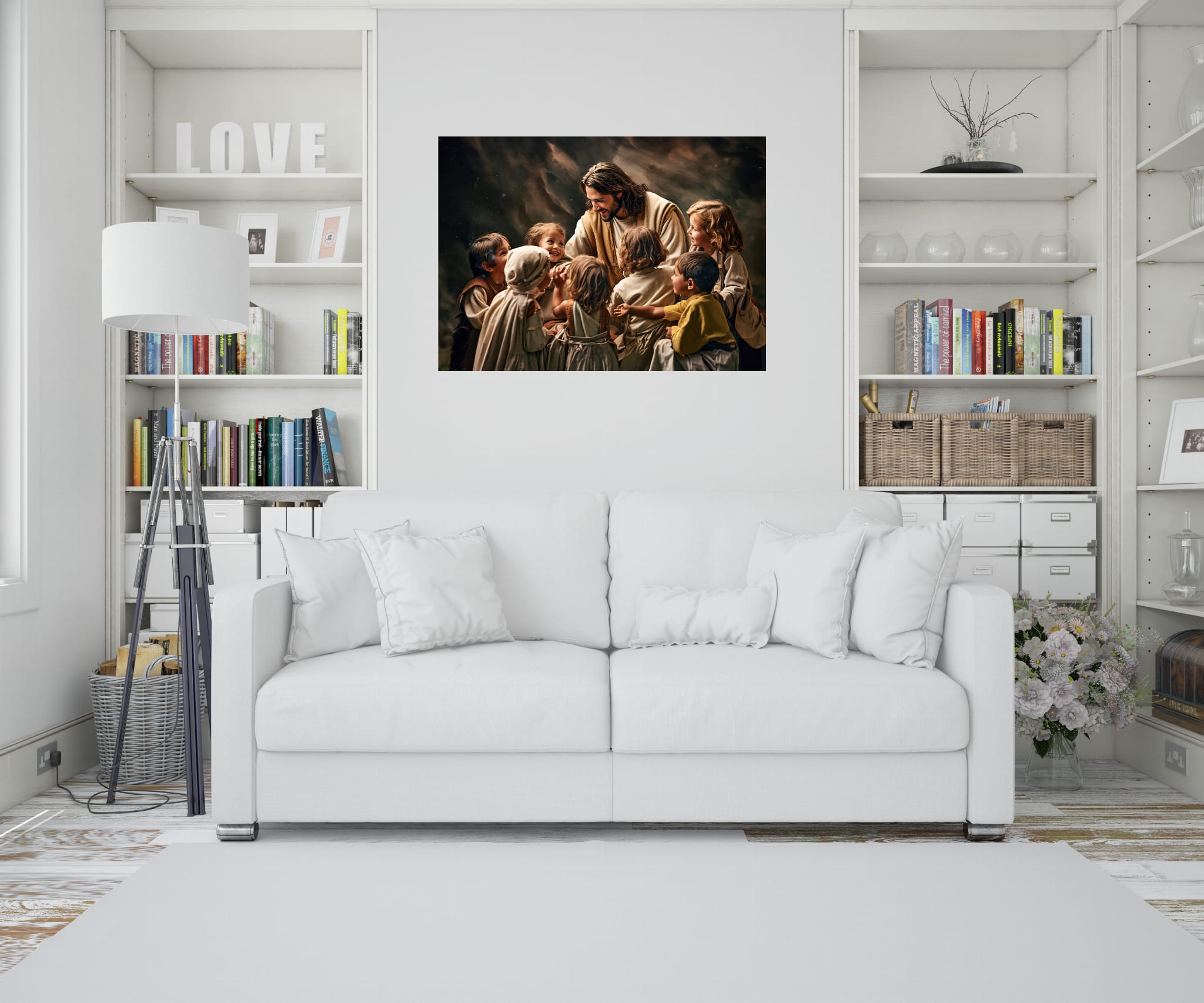 Ten niezwykle realistyczny obraz drukowany na płótnie nawiązuje do słów samego Jezusa, który powiedział: "Pozwólcie dzieciom przychodzić do mnie". Widzimy Jezusa otoczonego uśmiechniętymi dziećmi. Ten obraz oddaje istotę Pisma Świętego, które ukazuje, jak ważne jest otwarcie naszych serc na niewinność i mądrość dzieci oraz jak istotne jest przyjmowanie ich z miłością i szacunkiem.
