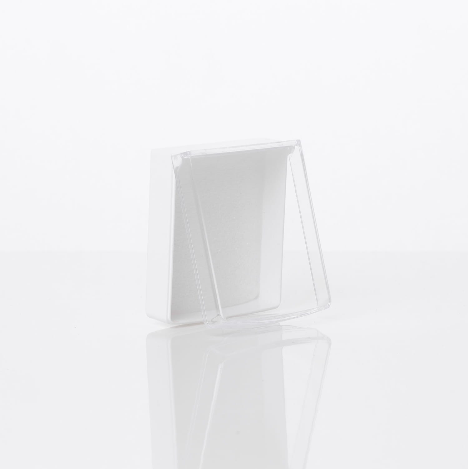 Duże pudełeczko na różaniec wykonane z plastiku. Wieczko przeźroczyste dół biały. Wieczko pudełeczka otwierane na zawiasku.
