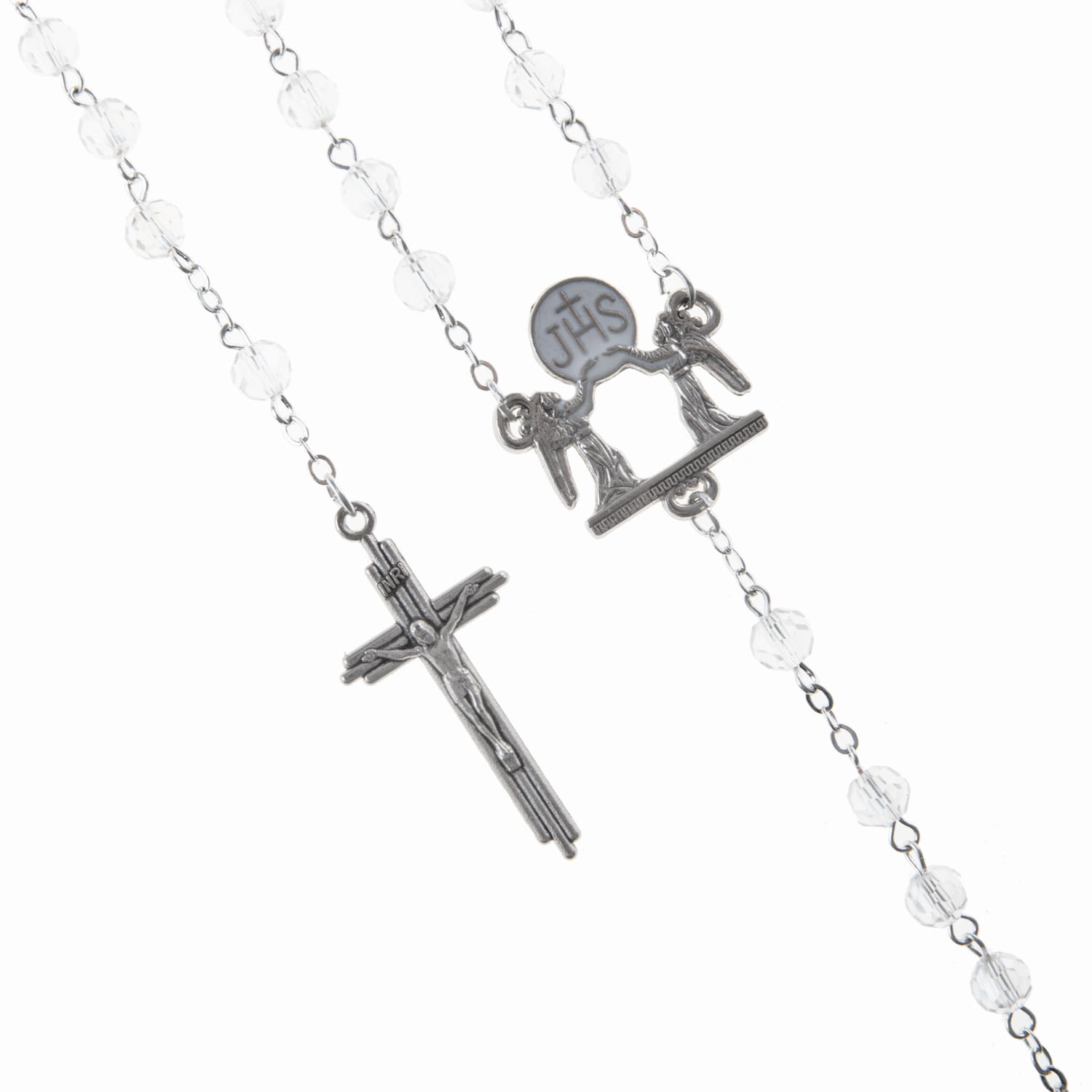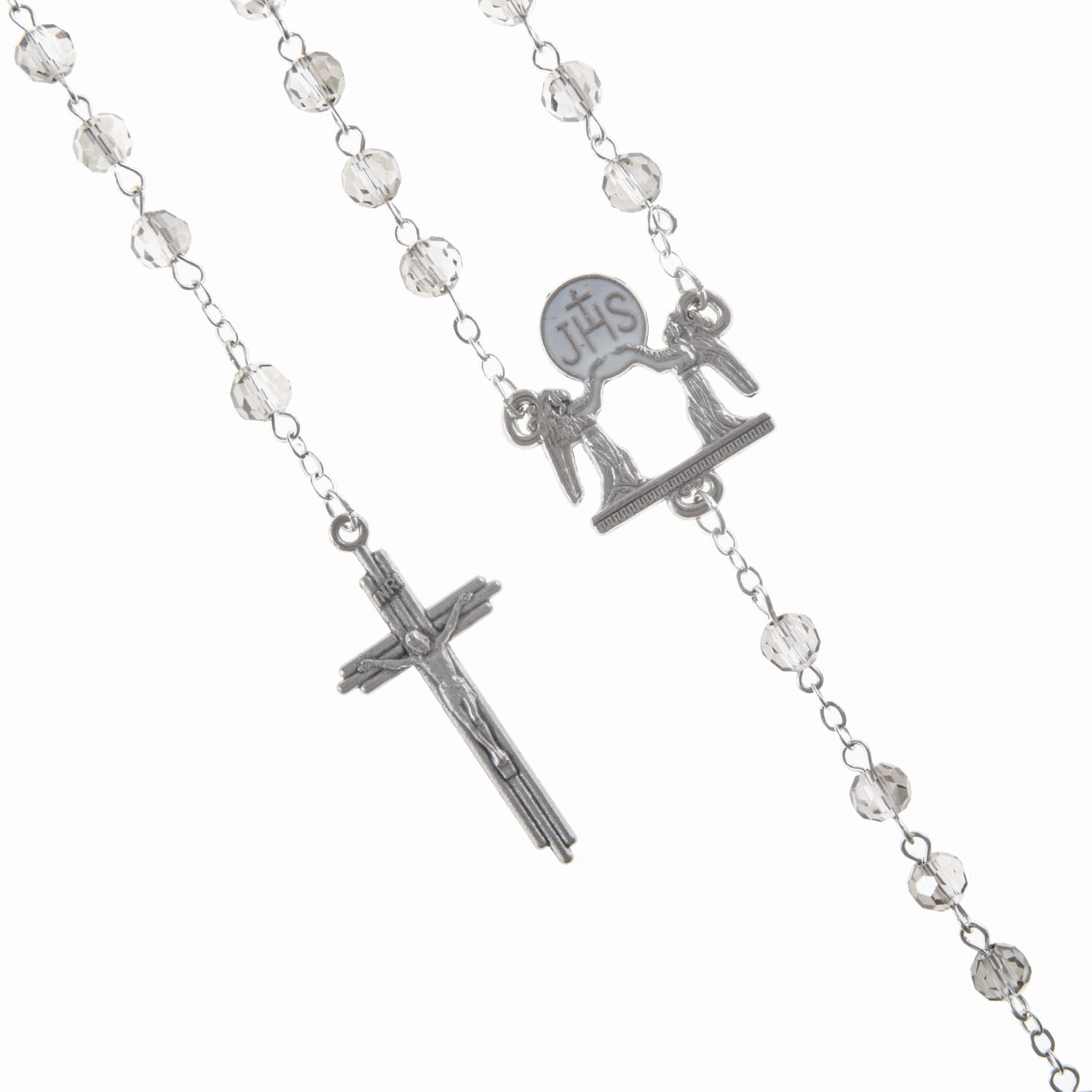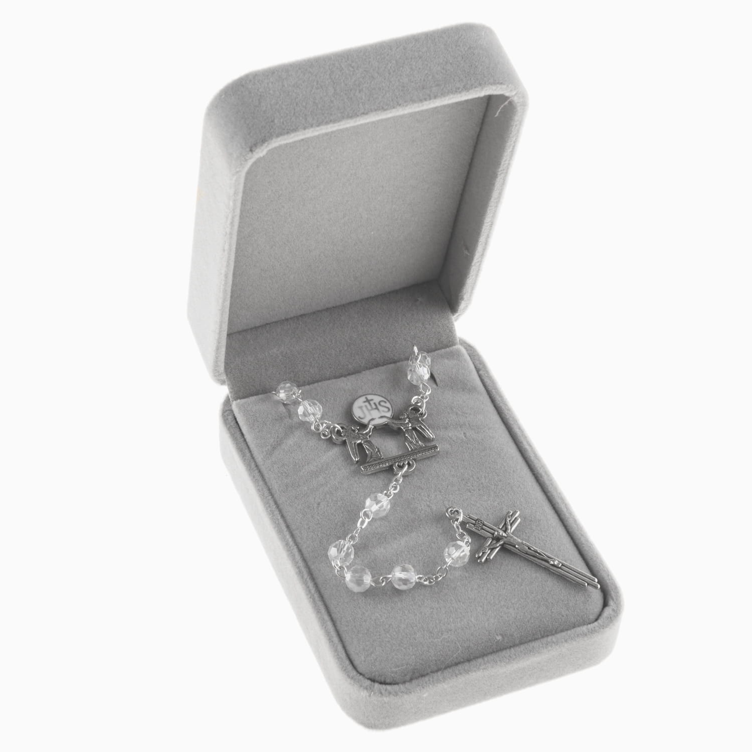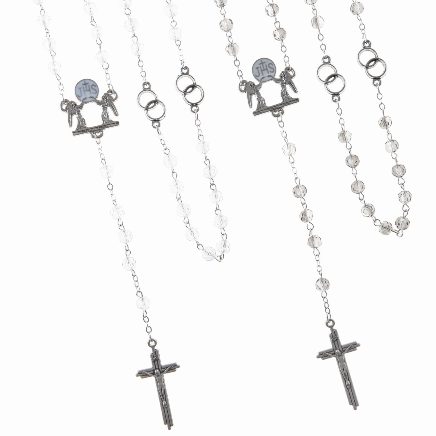 Różańce ślubne szklane dla pary młodej . W komplecie znajdują się dwa różańce, transparentny dymiony dla pana młodego oraz transparentny bezbarwny dla panny młodej. Paciorki w kształcie kuli o szlifowanych płaszczyznach. Łącznik różańca z wklejką IHS. Elementy metalowe ze stali nierdzewnej. Różańce ślubne zapakowane są w eleganckie flokowane pudełeczko.