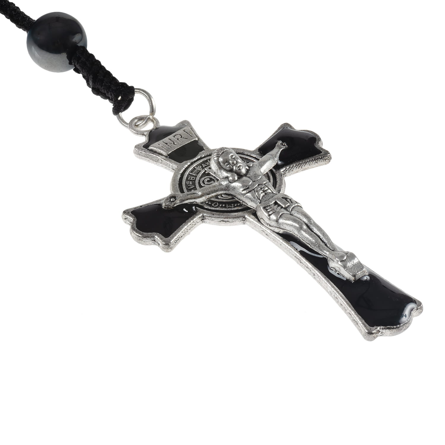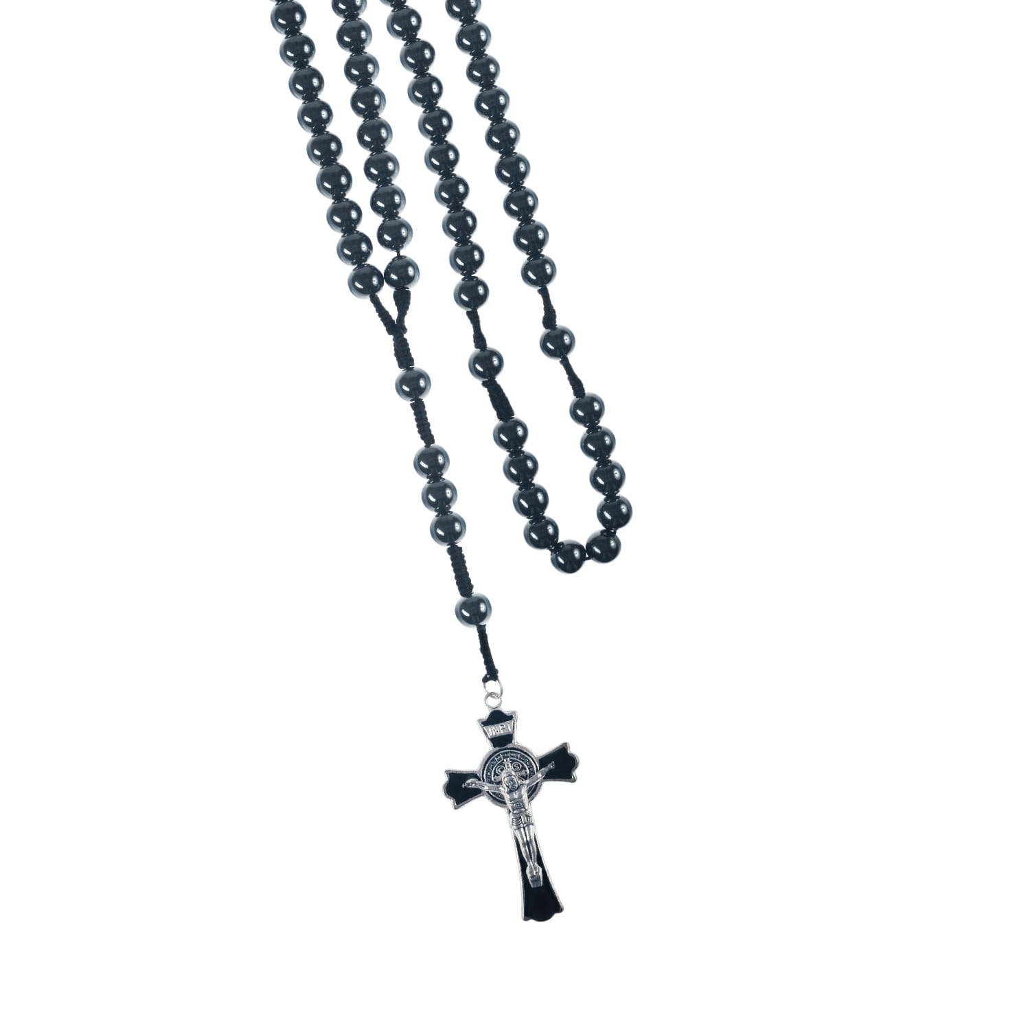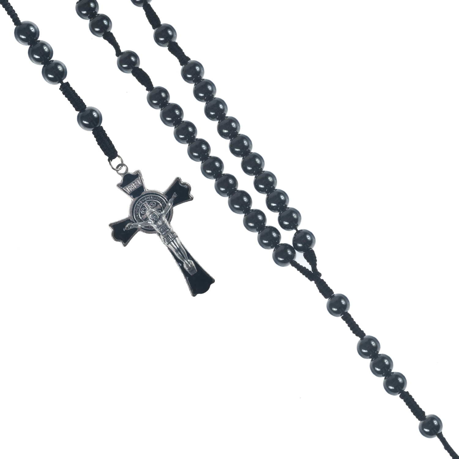 Solidny różaniec hematytowy na sznurku z metalowym krzyżem św. Benedykta.