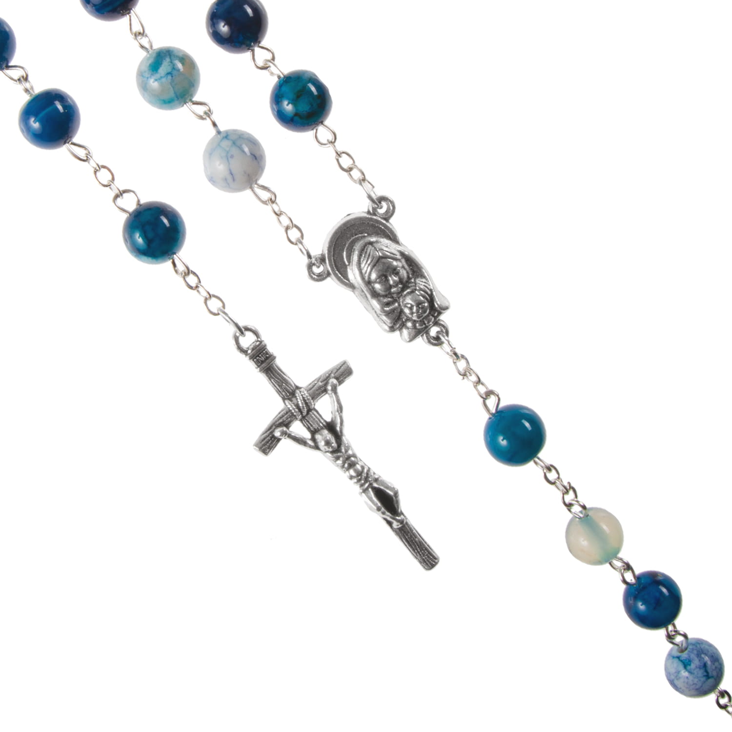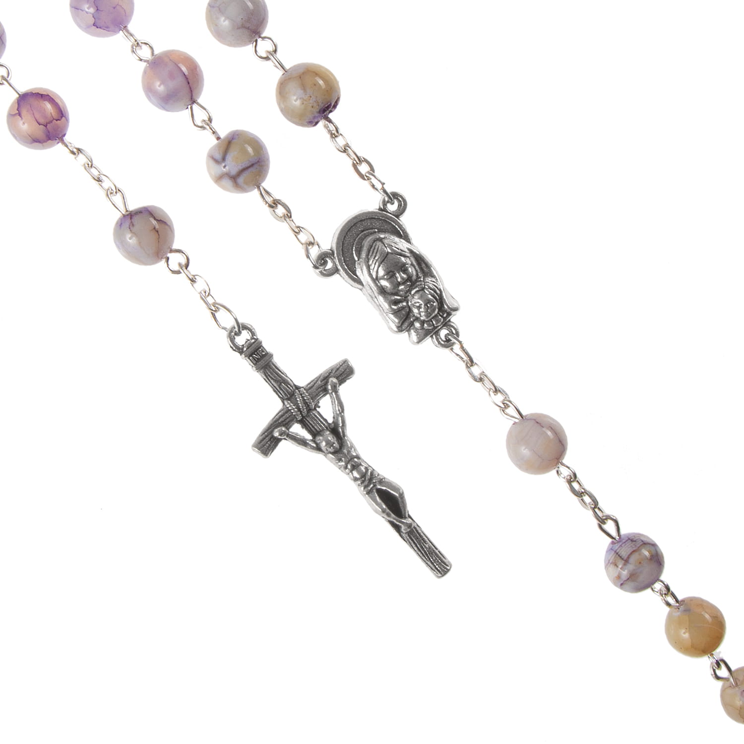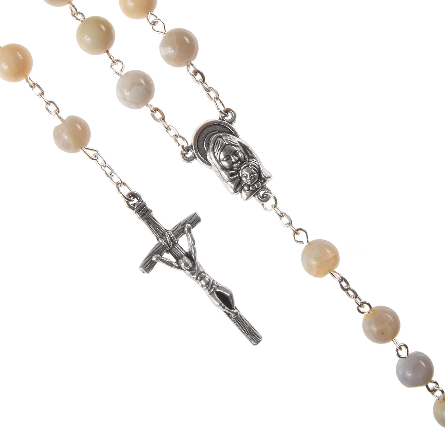 Różaniec wykonany z kamienia naturalnego - agat. Koraliki różańca w stylu - marmurek. Łącznik różańca z wizerunkiem Matki Boskiej oraz krzyżyk papieski w tonacji starego srebra. Elementy metalowe wykonane ze stali nierdzewnej. Różaniec w plastikowym pudełeczku.